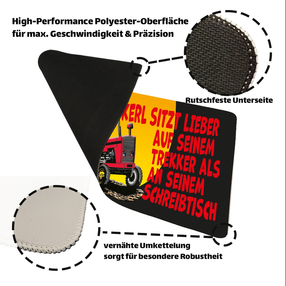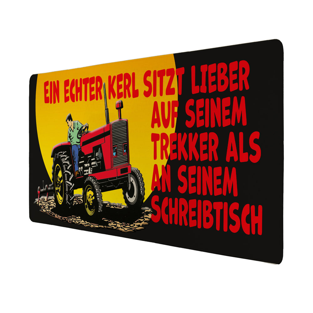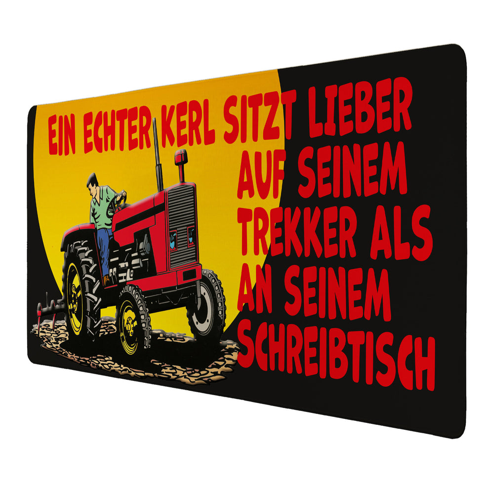 - Diese Schreibtischunterlage zeigt einen starken Mann vor einem malerischen Sonnenuntergang, der seinen Trekker mit Stolz über das weite Feld lenkt. Der Spruch "Ein echter Kerl sitzt lieber auf seinem Trekker als an seinem Schreibtisch" verleiht der Unterlage einen humorvollen und bodenständigen Charme.