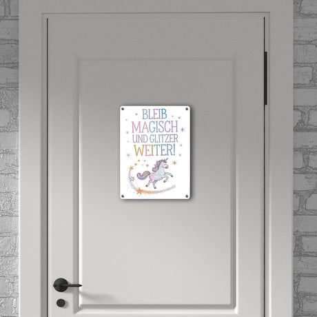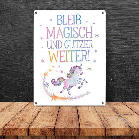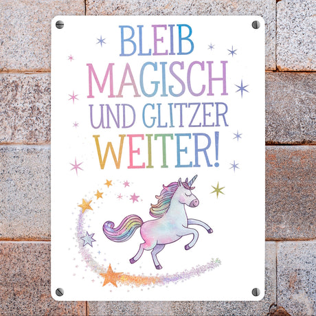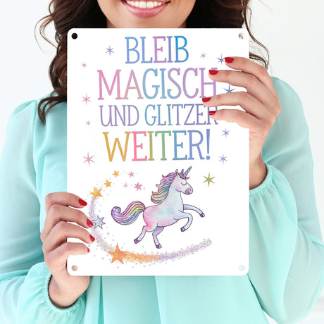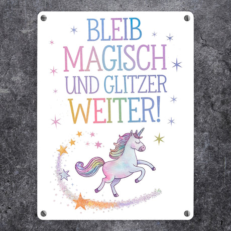 Ab €7,90Grundpreis /Nicht verfügbarAuf LagerEinhorn mit Regenbogenmähne Metallschild in 15x20 cm Bleib magisch, glitzer weiter