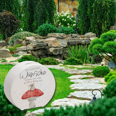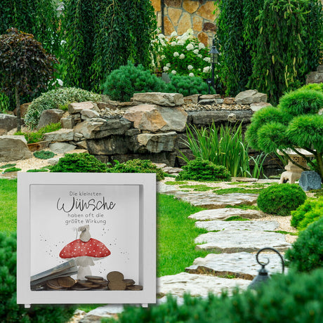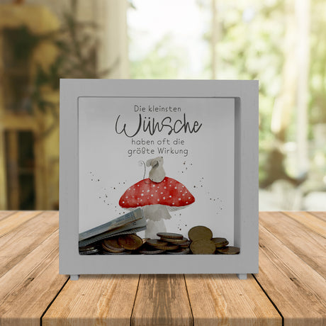 Ab €6,95Grundpreis /Nicht verfügbarAuf LagerMaus auf Fliegenpilz Spardose mit Spruch Kleinste Wünsche größte Wirkung