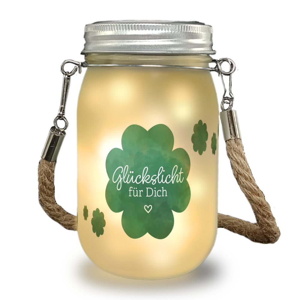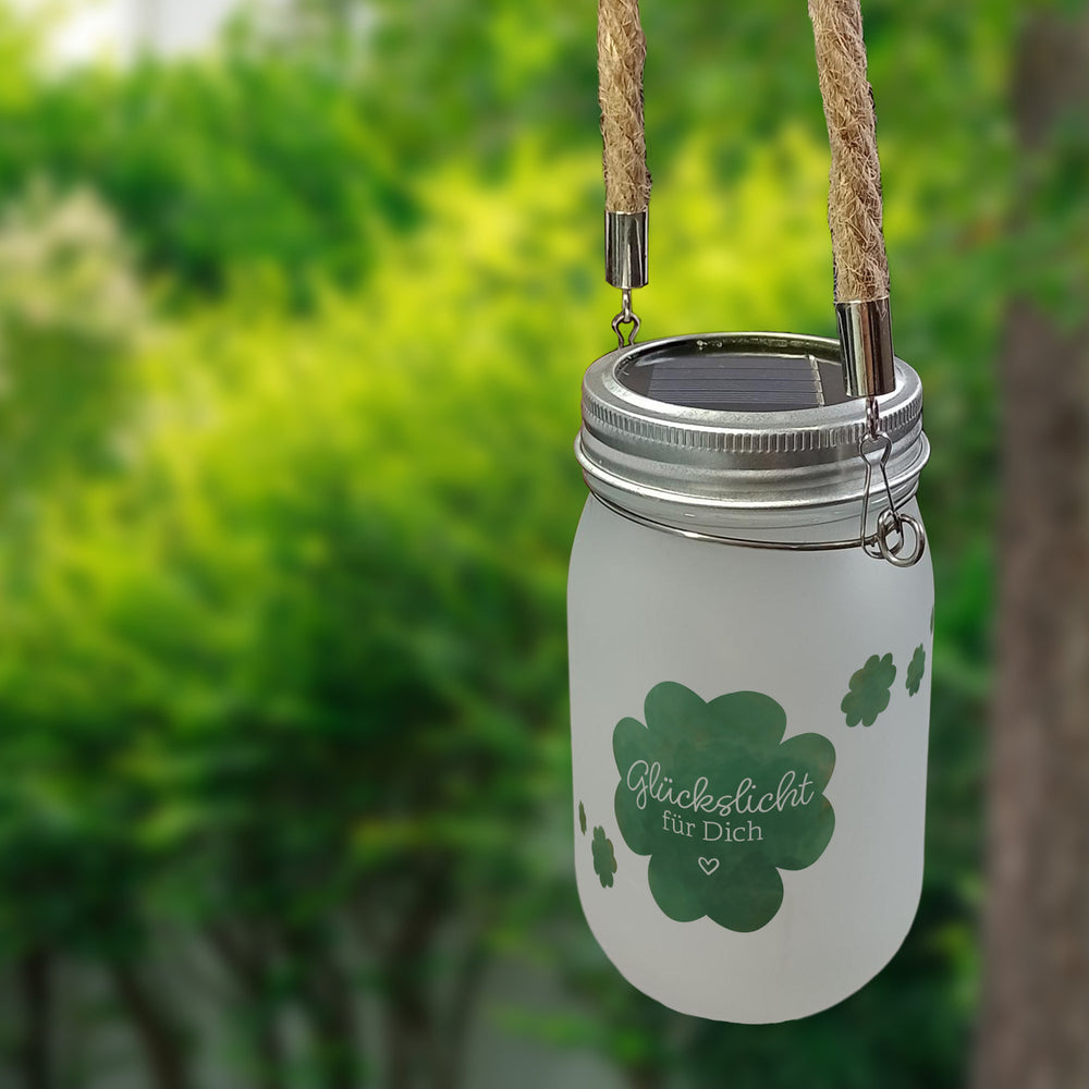 - Unser Solarlicht strahlt in romantischer Einmachglas-Optik mit nostalgischem Strickhenkel. Das Design ist geprägt von grünen vierblättrigen Kleeblättern, die Glück symbolisieren. Perfekt als Dekolicht fürs Wohnzimmer oder den Außenbereich. Mit Solarantrieb ist es umweltfreundlich und benötigt keine Batterien.