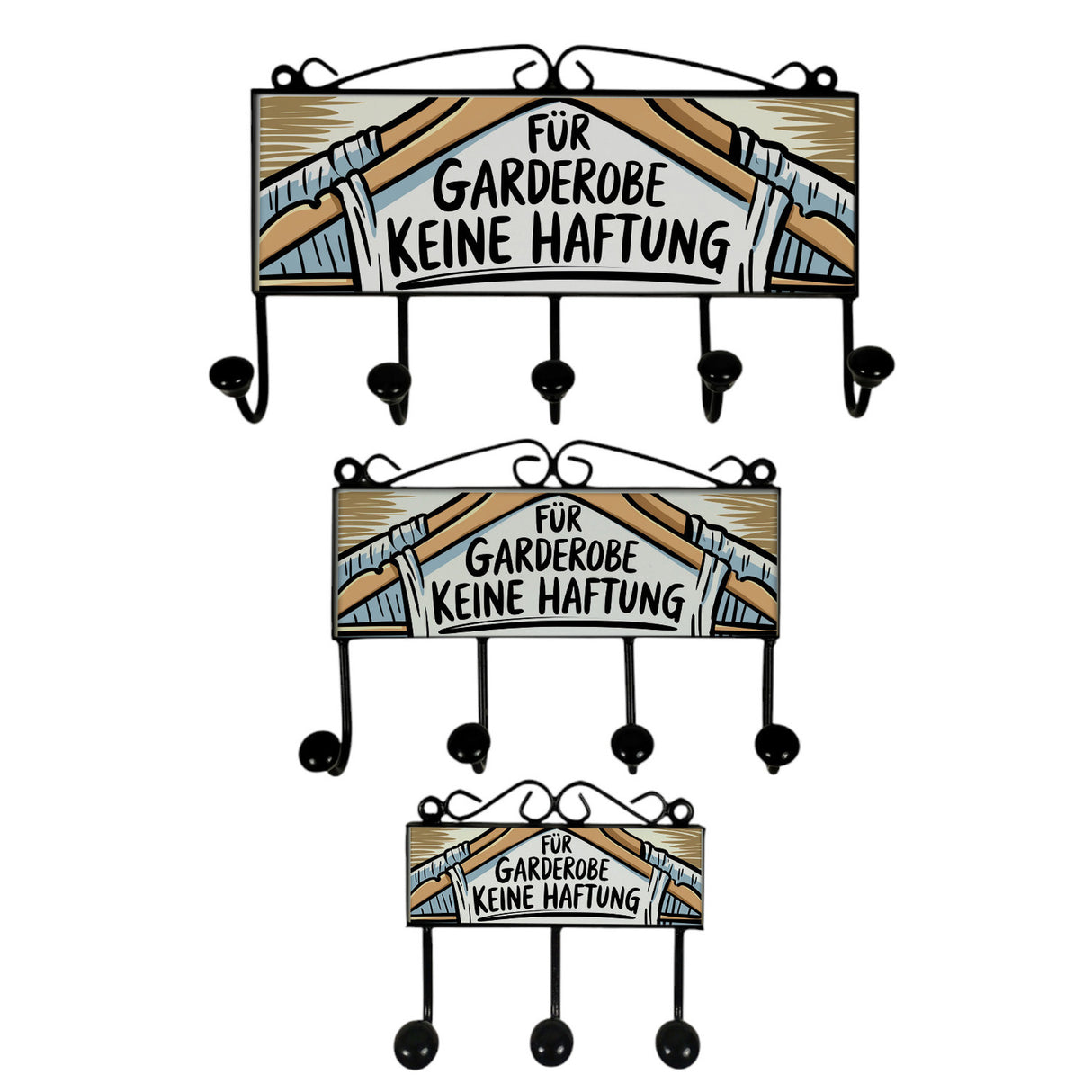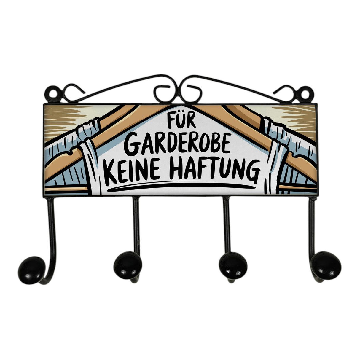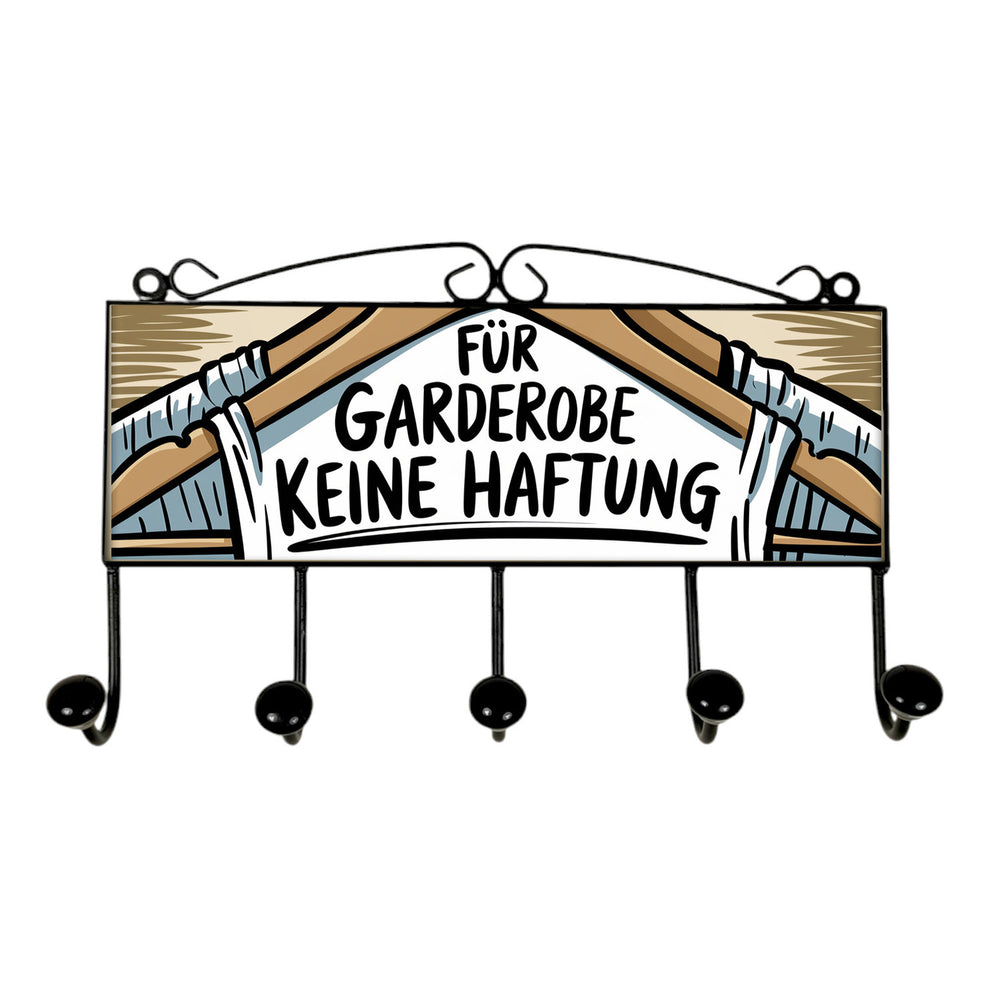 - Die Kleiderhakenleiste ist ein echter Hingucker! Mit einer handgezeichneten Illustration eines Kleiderbügels und dem lustigen Spruch "Für Garderobe keine Haftung" bringt sie Stil und Humor in jeden Flur. Der beige Hintergrund verleiht dem Design einen klassischen Touch, der in jedem Zuhause einen charmanten Akzent setzt.
