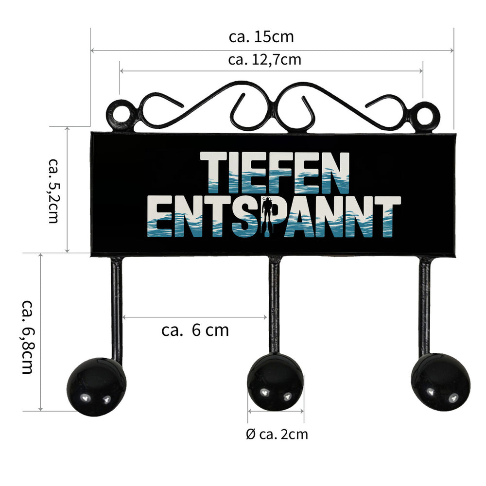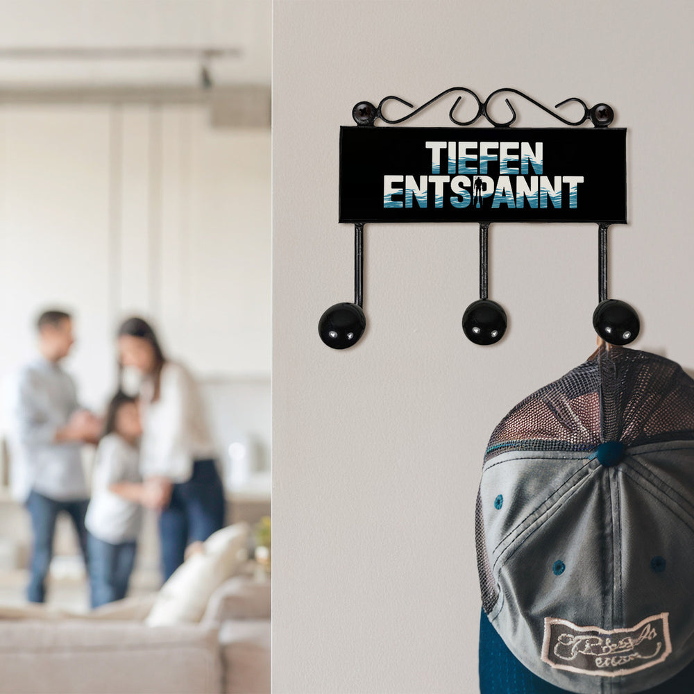 - Entdecke die ultimative Wandgarderobe für Meeresliebhaber! Diese Kleiderhakenleiste besticht durch ihr maritimes Design auf einem schwarzen Hintergrund. Der große, humorvolle Schriftzug "TIEFEN ENTSPANNT", in blauen Blockbuchstaben, umrahmt die Silhouette eines Tauchers. Perfekt für alle, die das Meer und Tauchen lieben!