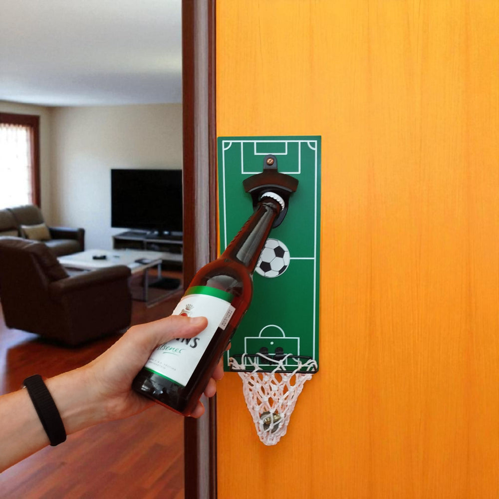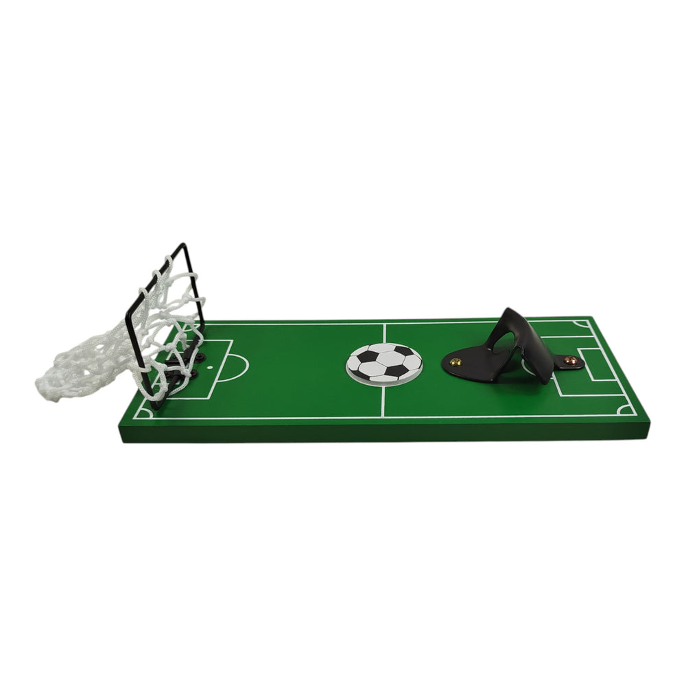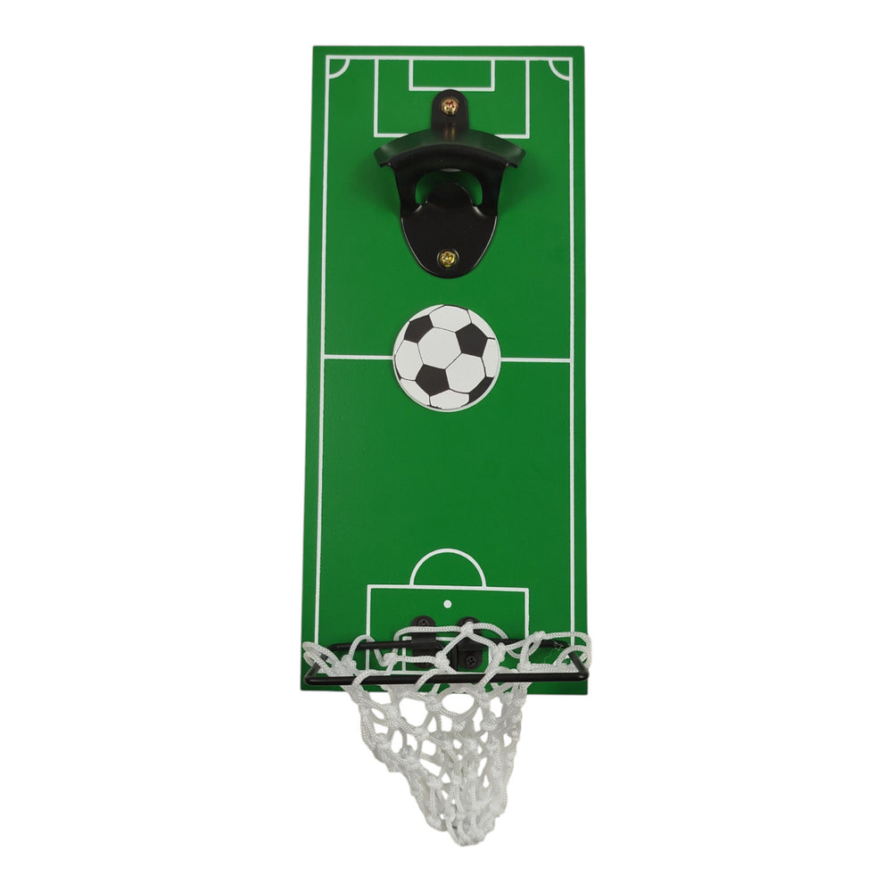 - Das Design ist clever und spaßig: ein kleines Fußballfeld aus Holz, in fröhlichem Grün, Schwarz und Weiß. Mit einem Netz ausgestattet, verwandelt dieser Flaschenöffner den Kronkorken in einen echten Torschuss. Einfach an die Wand hängen und los geht's - jeder Öffnungsvorgang wird zum spannenden Moment.