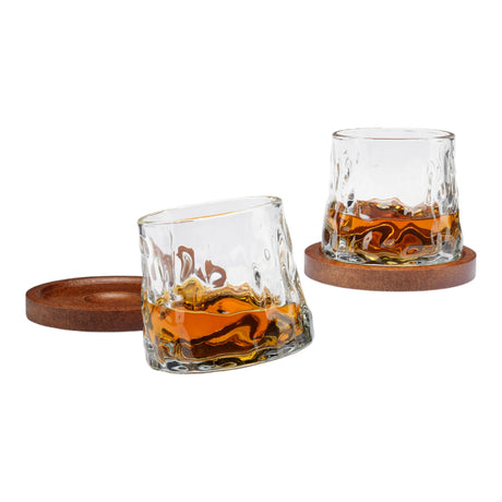 - Diese Whiskygläser haben eine raffinierte Rundung am Boden, die sie leicht schief stehen lässt. Das Schwenken des Whiskys wird damit zum Kinderspiel! Kombiniert mit eleganten Holz-Untersetzern, bleiben die Gläser gerade stehen und bieten eine spannende Optik und Haptik dank ihrer leichten Wölbungen.