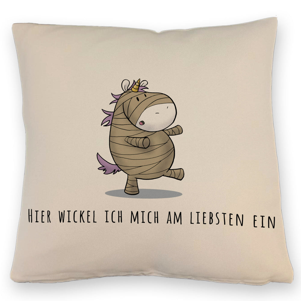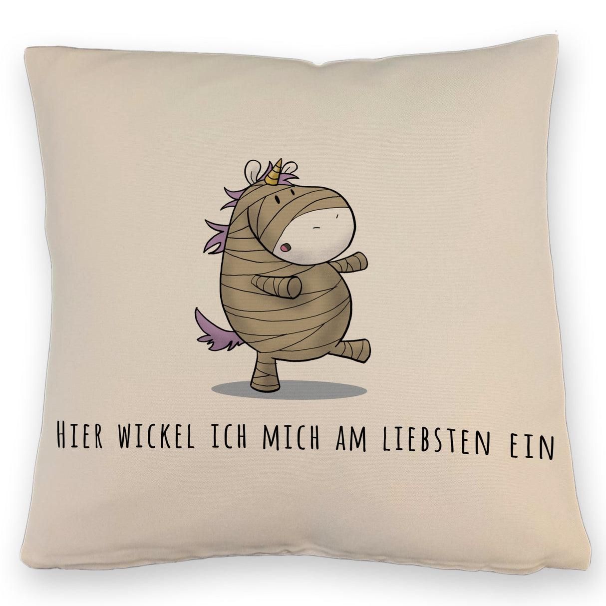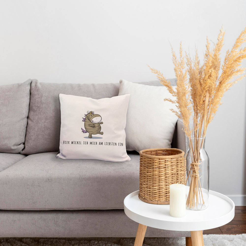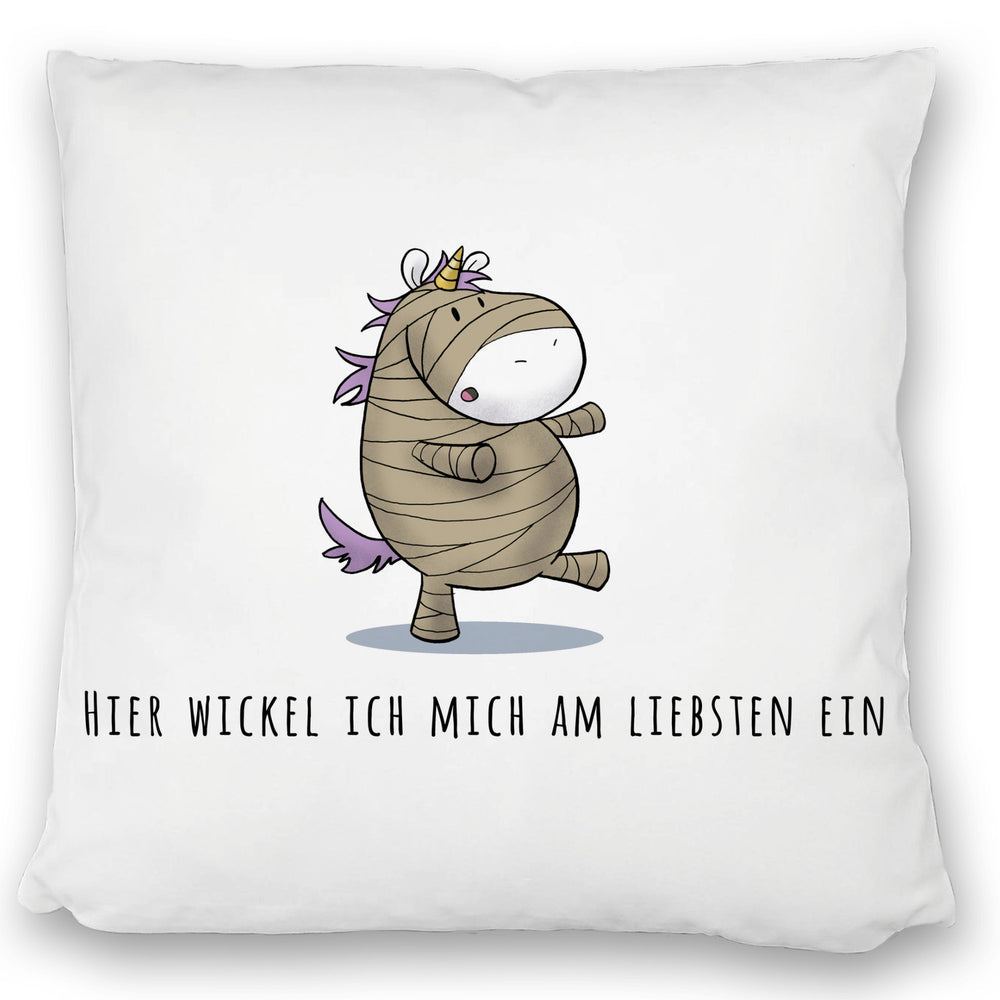 Einhorn-Mumie Kissen mit Spruch Hier wickel ich mich am liebsten ein