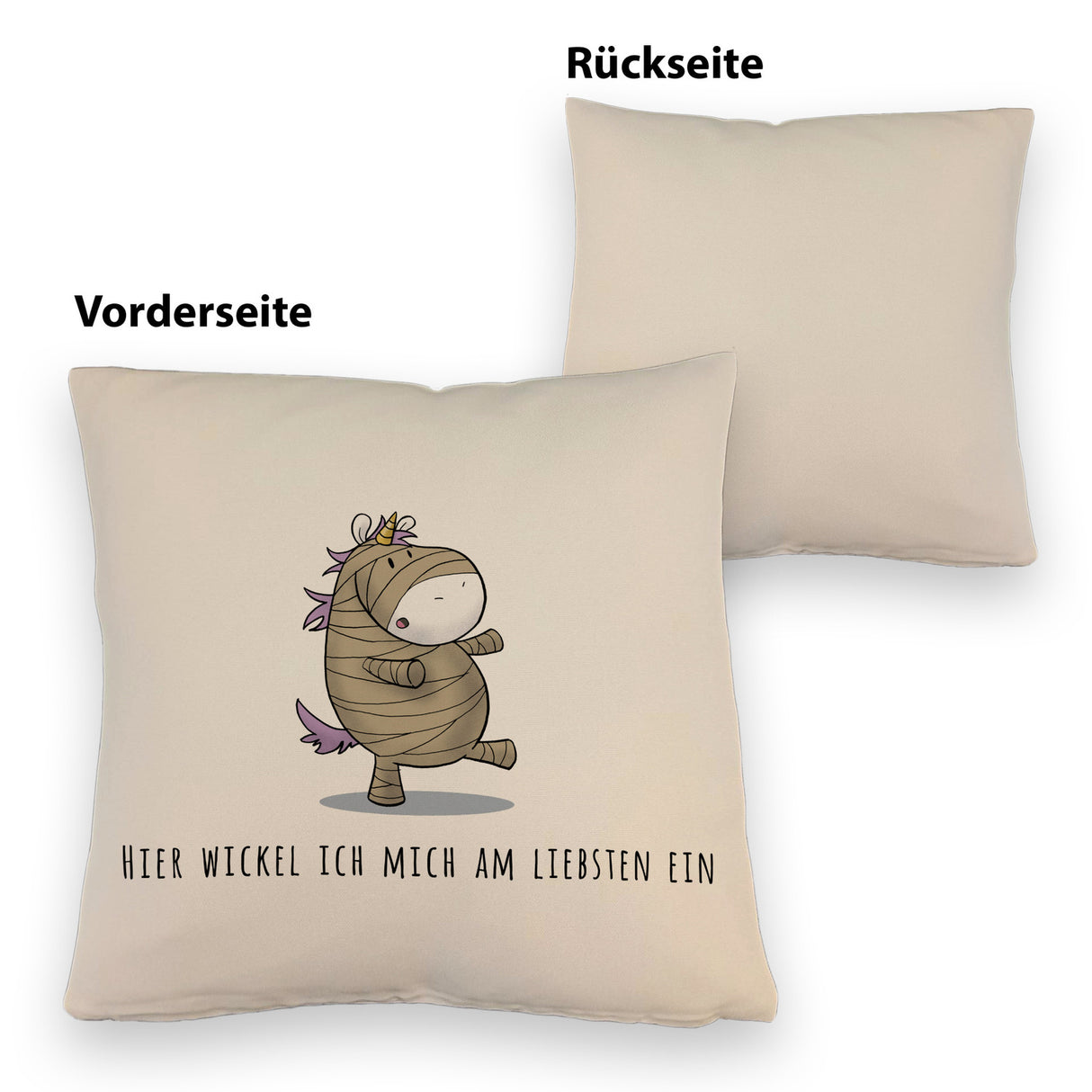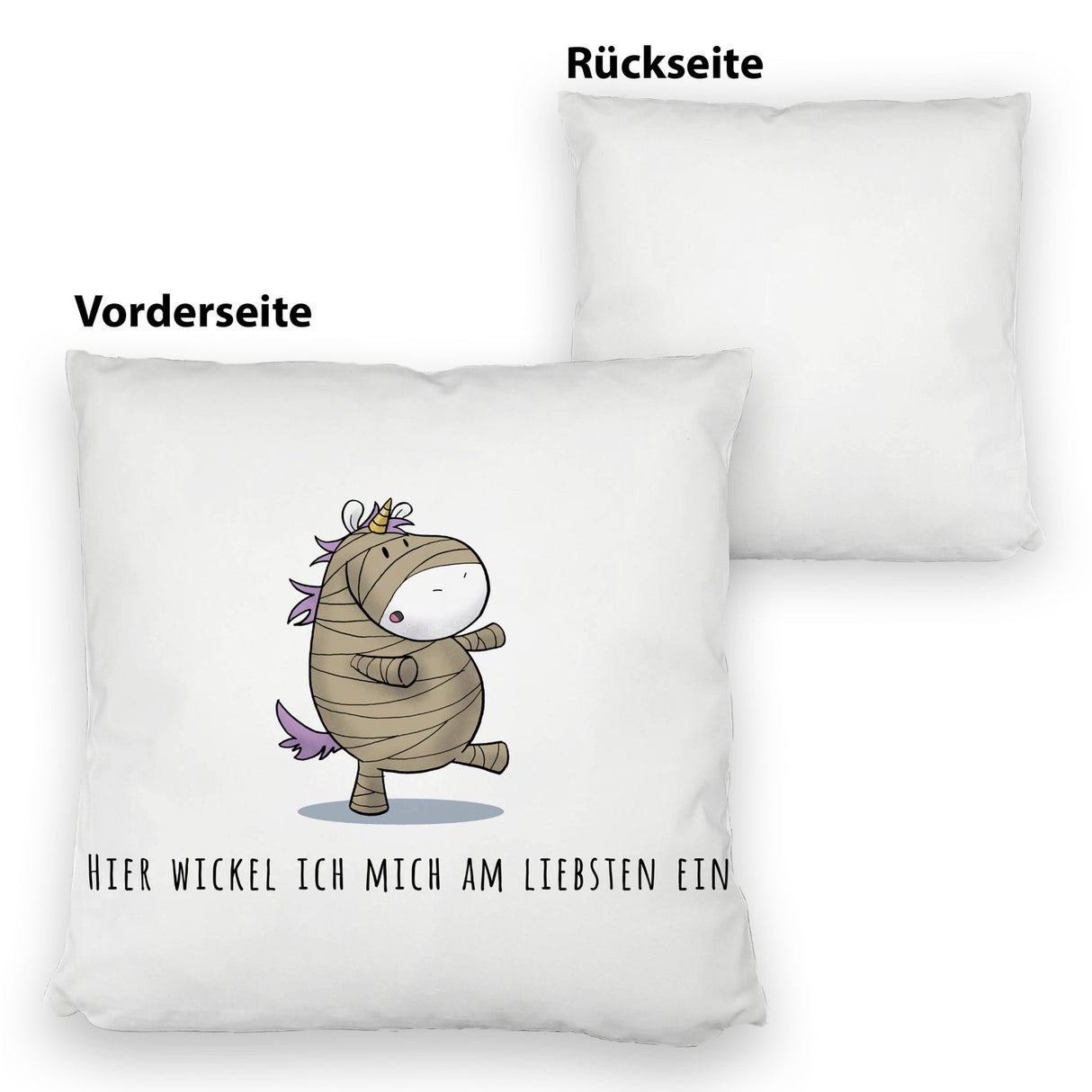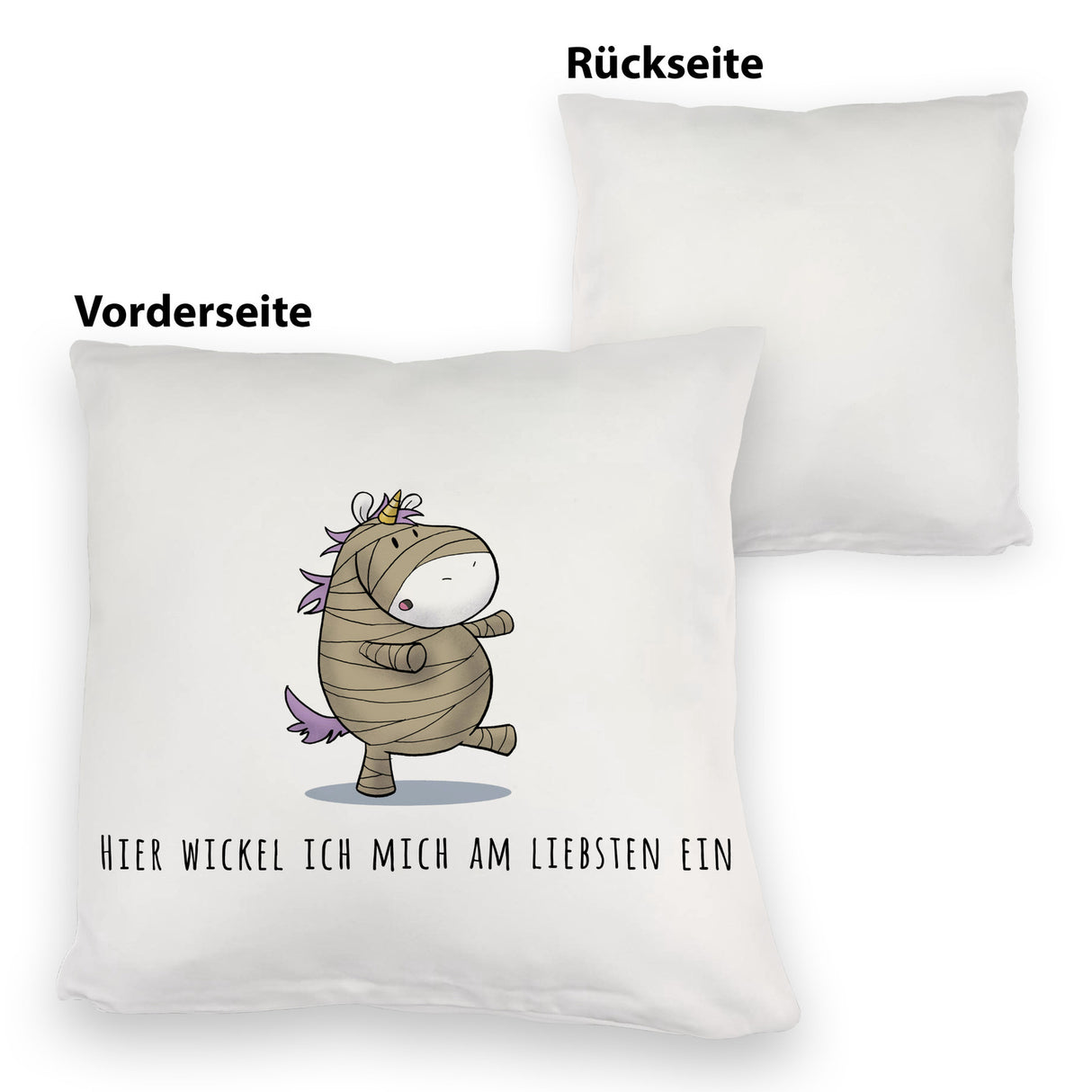 - 1x Einhorn-Mumie Kissen mit Spruch Hier wickel ich mich am liebsten ein in der gewählten Ausführung