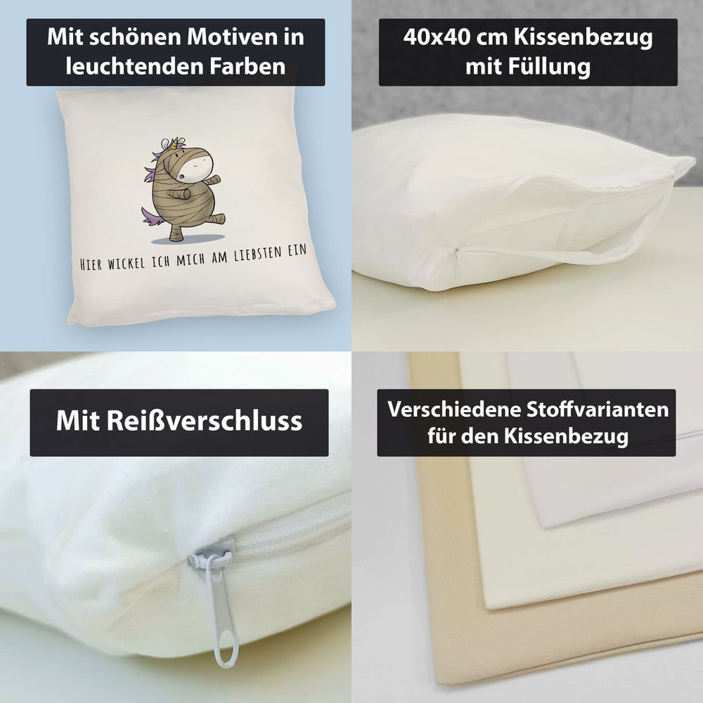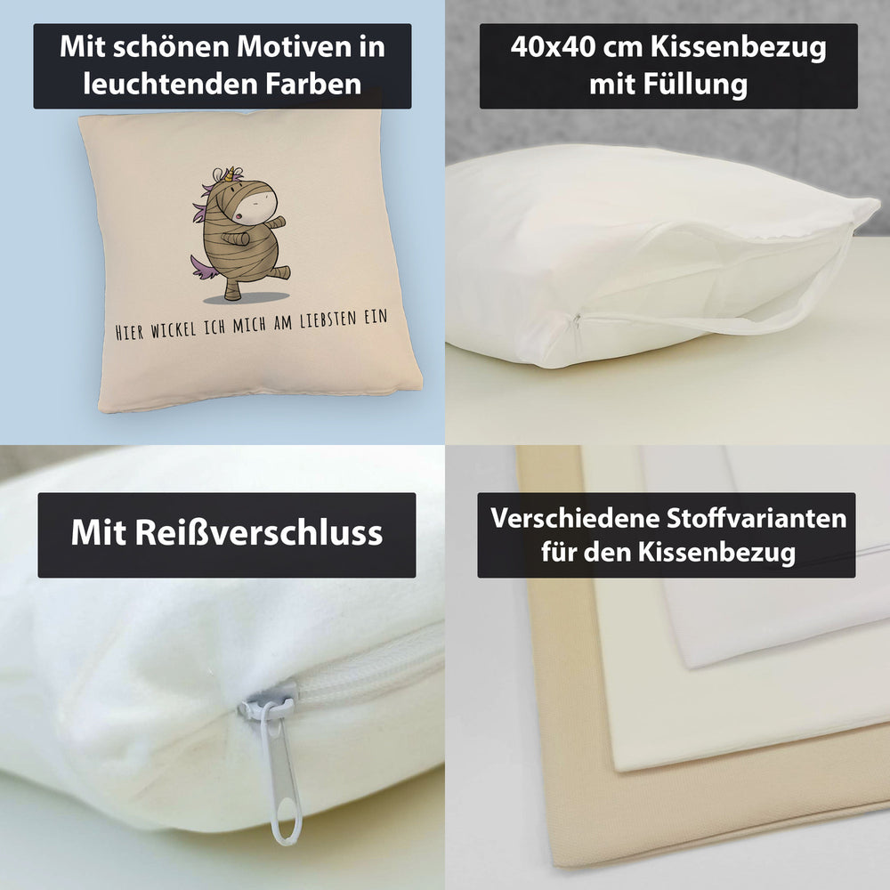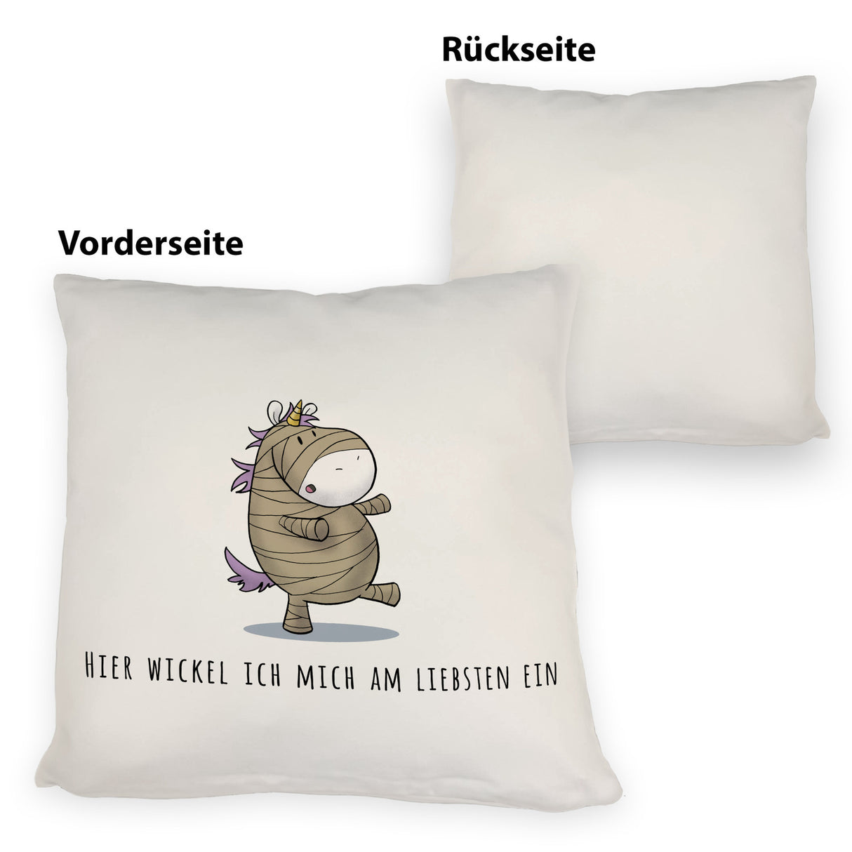 - 1x Einhorn-Mumie Kissen mit Spruch Hier wickel ich mich am liebsten ein in der gewählten Ausführung