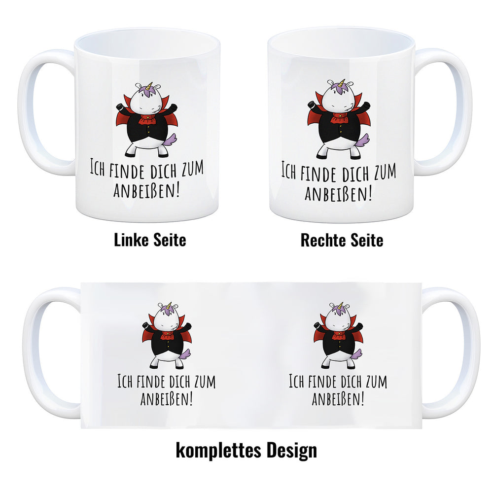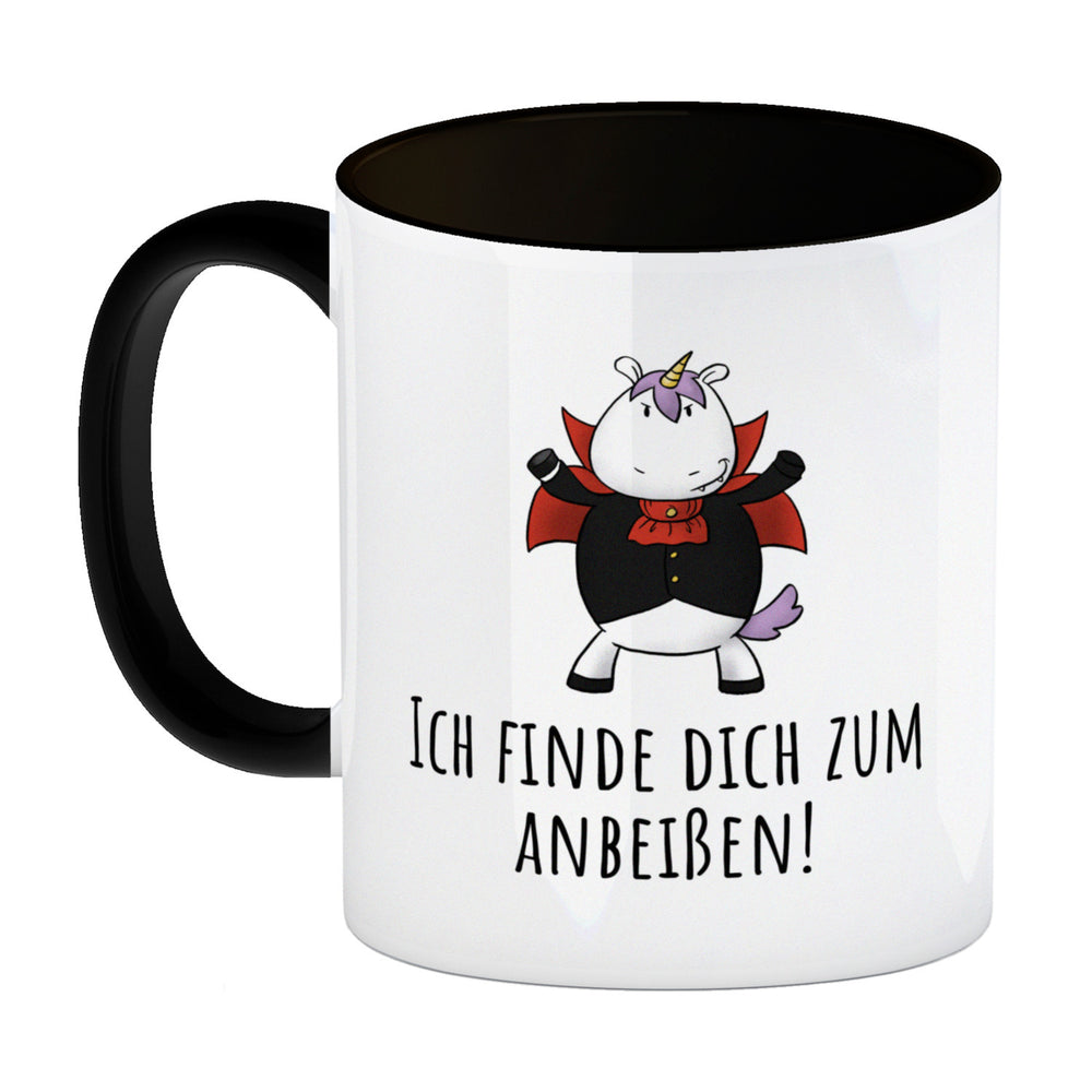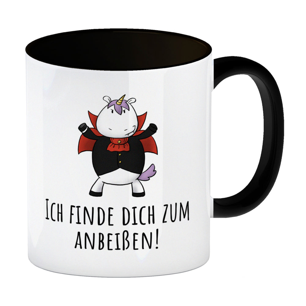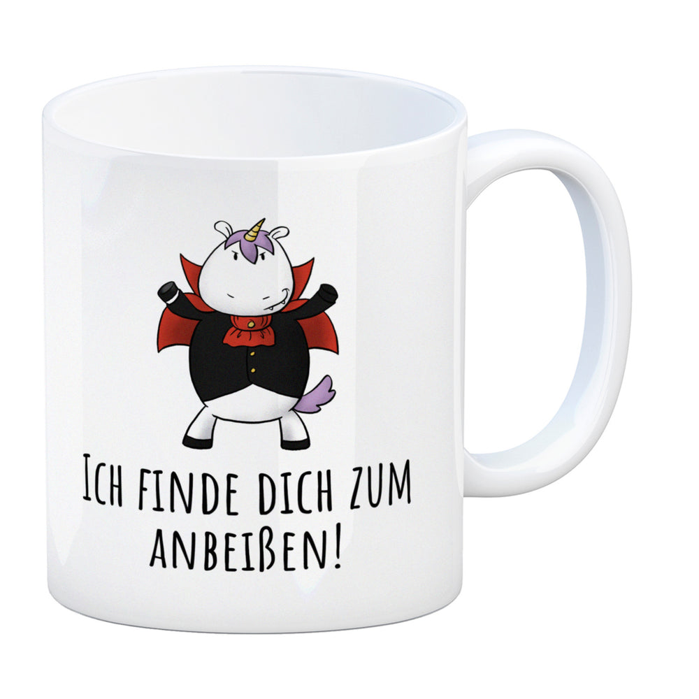 • 1x Einhorn-Vampir Kaffeebecher mit Spruch Ich finde dich zum Anbeißen in der gewählten Ausführung