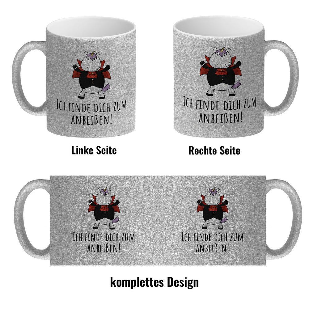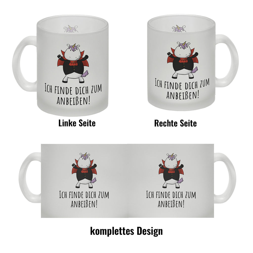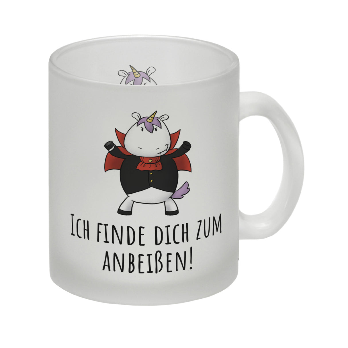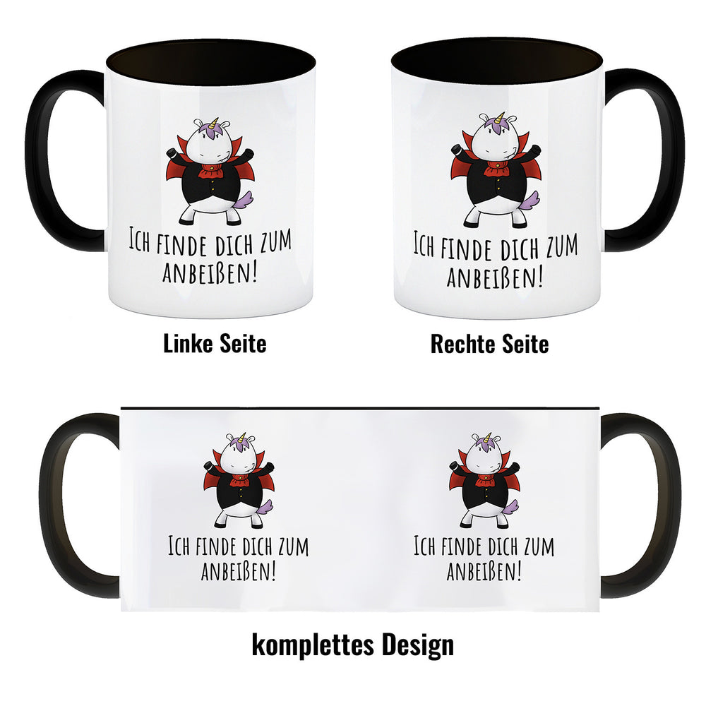• 1x Einhorn-Vampir Kaffeebecher mit Spruch Ich finde dich zum Anbeißen in der gewählten Ausführung