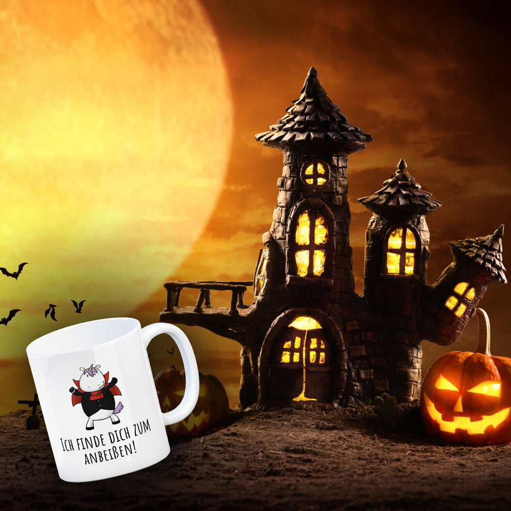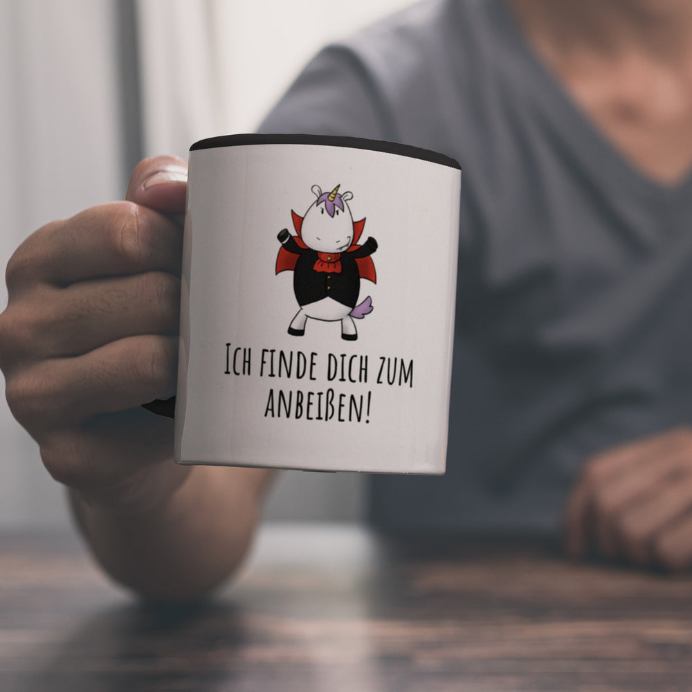 Einhorn-Vampir Kaffeebecher mit Spruch Ich finde dich zum Anbeißen