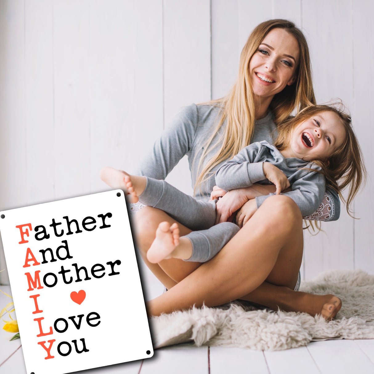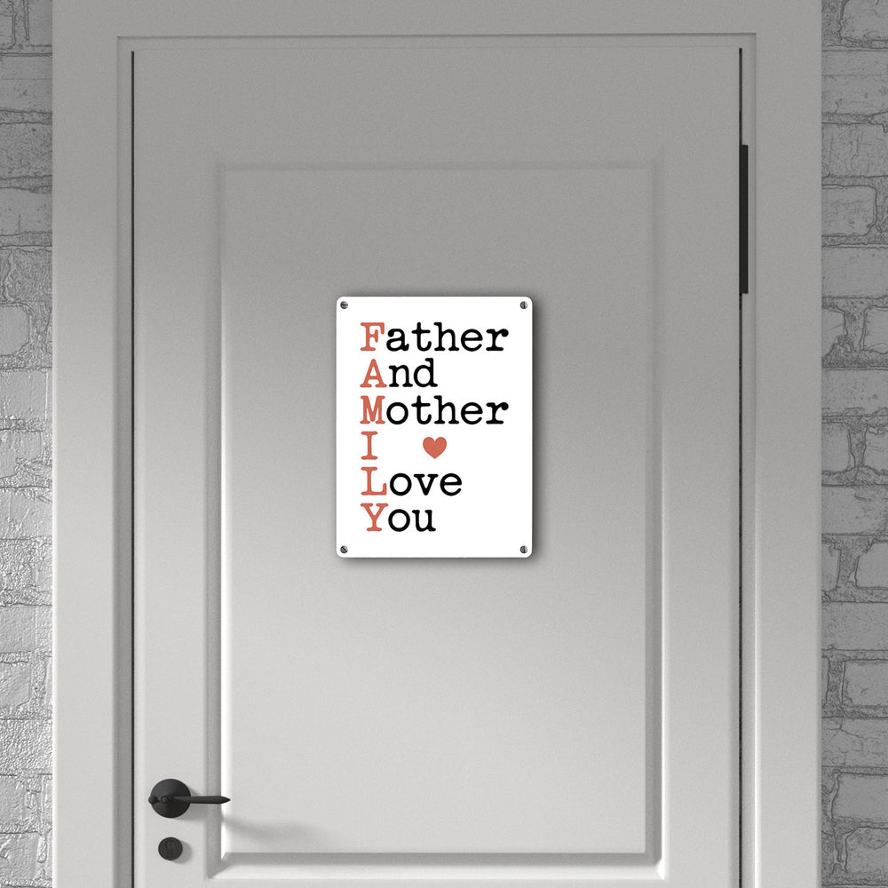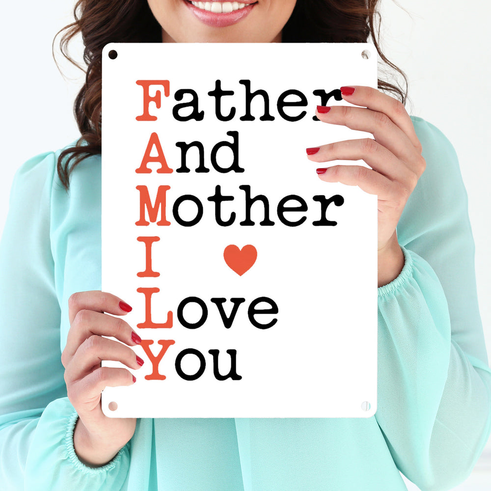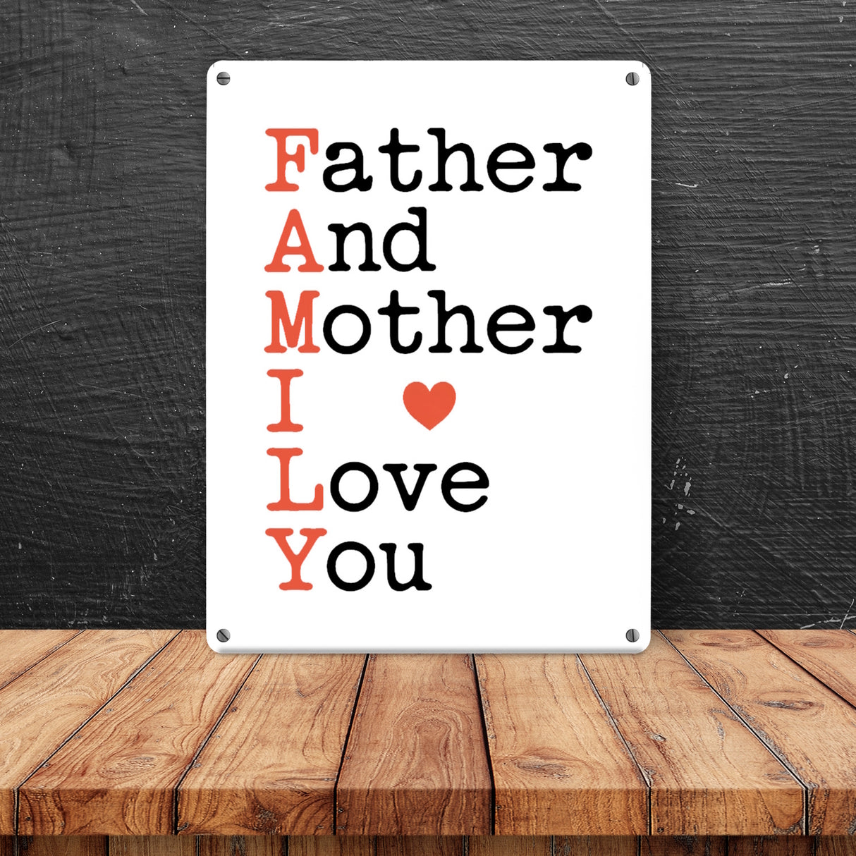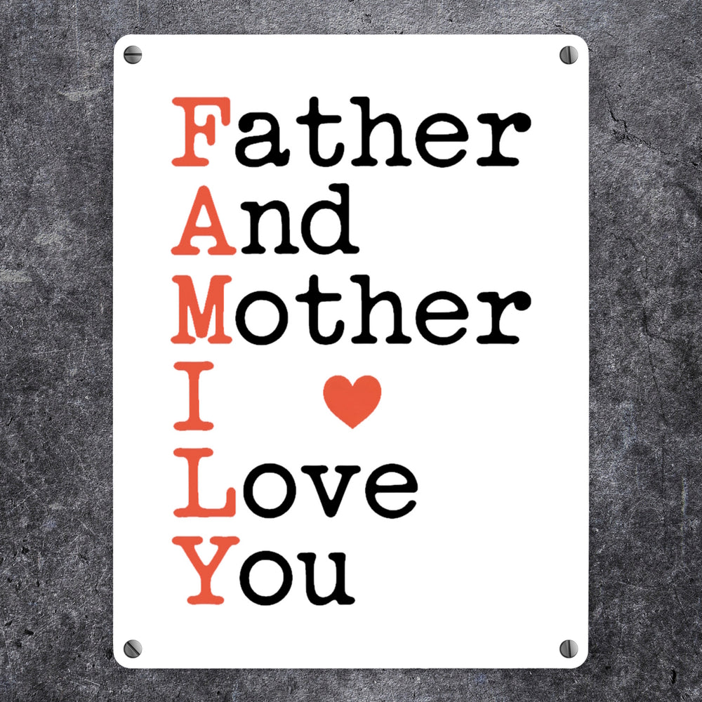 - Dieses Metallschild ist ein stilvolles Kunstwerk mit schlichter Eleganz. Der Text im Schreibmaschinenstil zeigt die Botschaft "Father And Mother I Love You", wobei die Initialen das Wort "Family" bilden – gekrönt von einem kleinen roten Herz. Ein emotionaler Hingucker und Zeichen der Wertschätzung für die Familie.