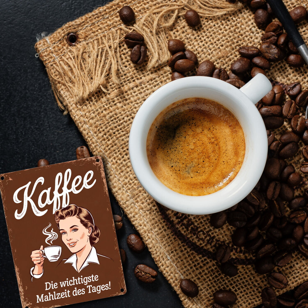 - Verwandle deine Küche in eine Retro-Oase und erinnere dich täglich daran, wie wichtig eine gute Tasse Kaffee ist! Hol dir jetzt das lustige, ansprechende Metallschild und starte jeden Morgen mit guter Laune.