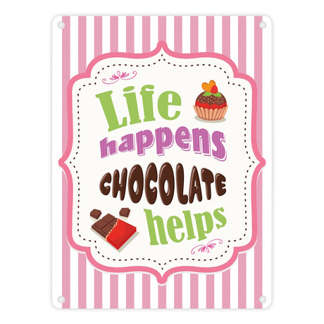 Metallschild mit Spruch: Life Happens - Chocolate Helps