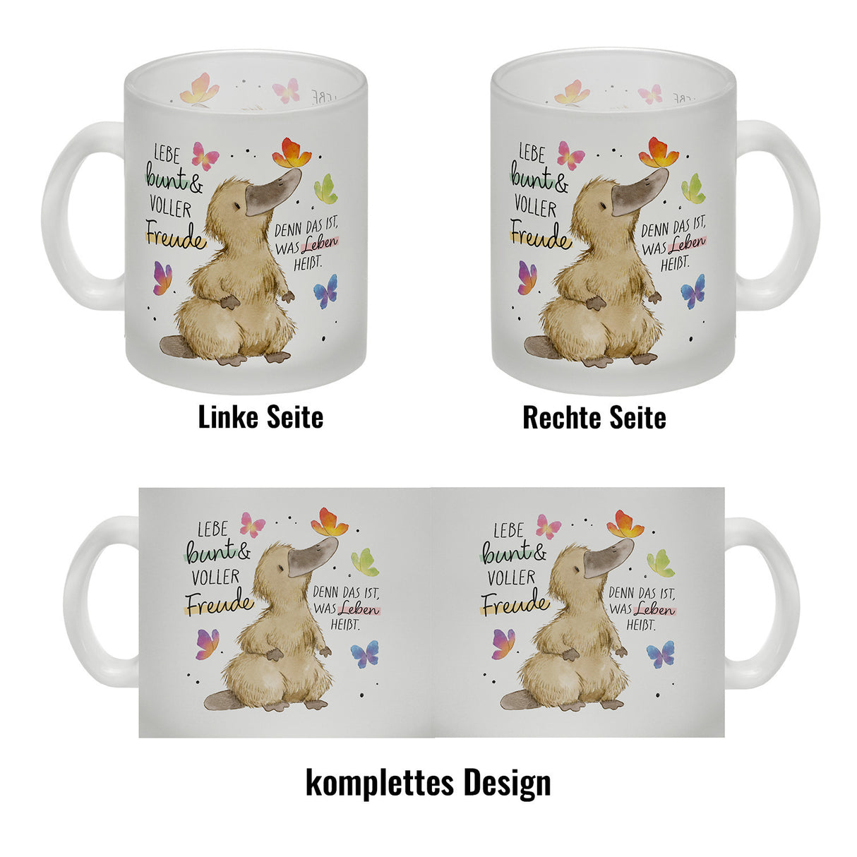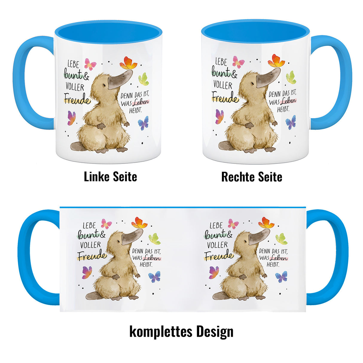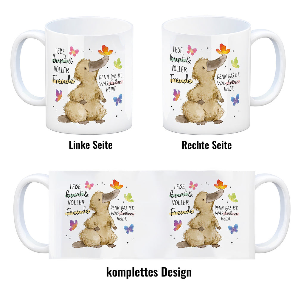 Schnabeltier Kaffeebecher mit Spruch Lebe bunt und freudig