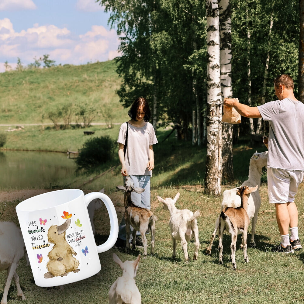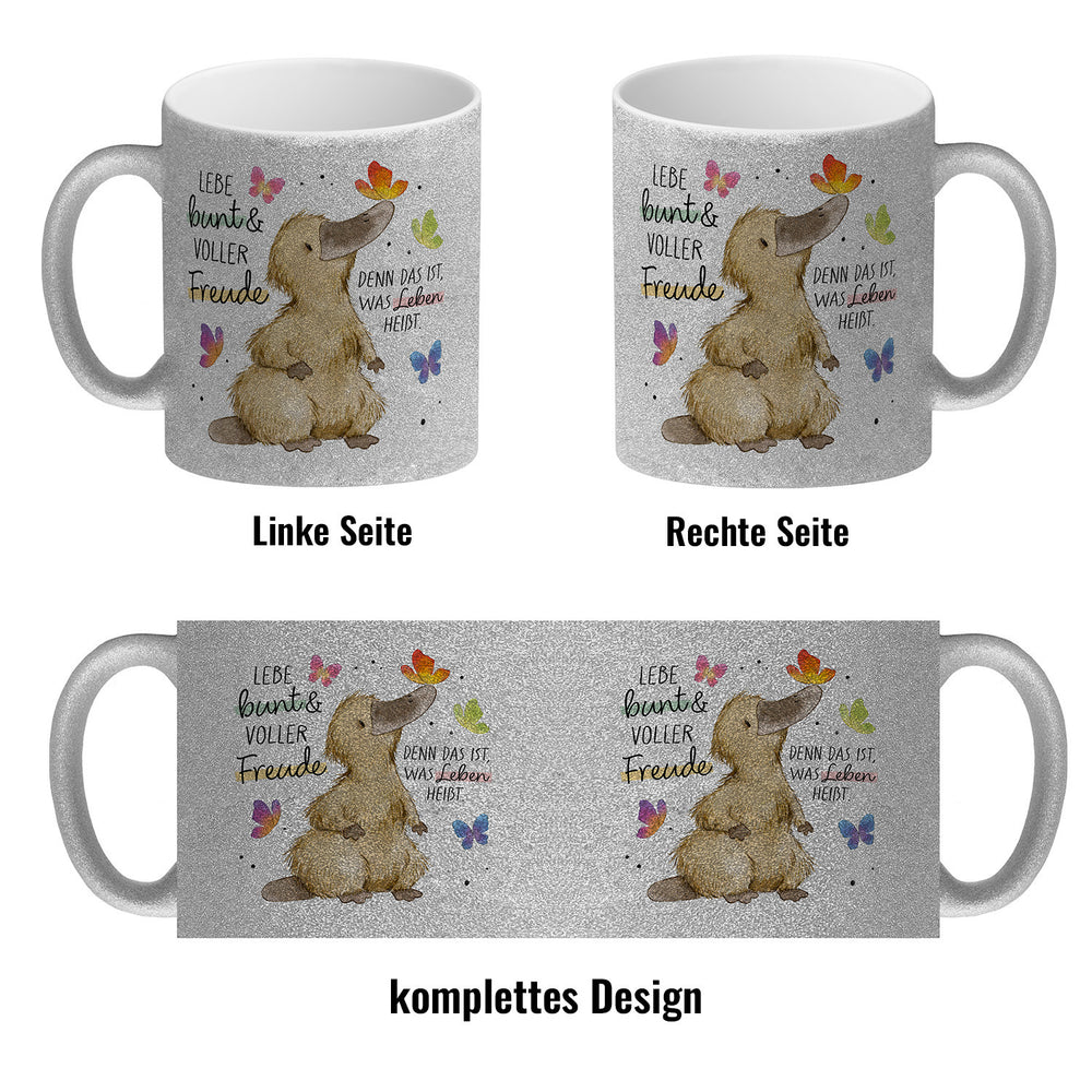 - 1x Schnabeltier Kaffeebecher mit Spruch Lebe bunt und freudig in der gewählten Ausführung