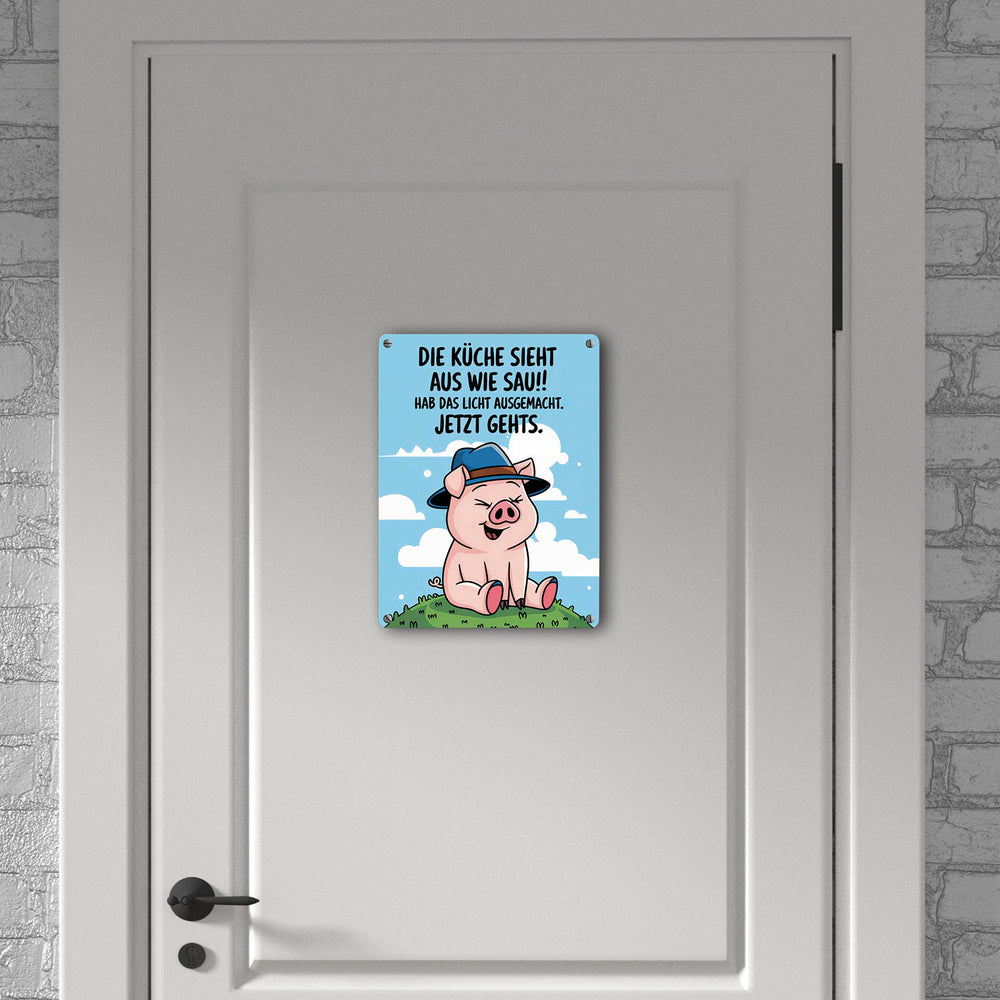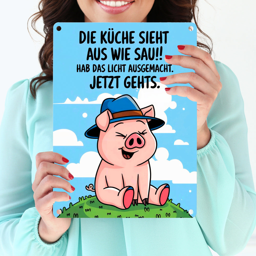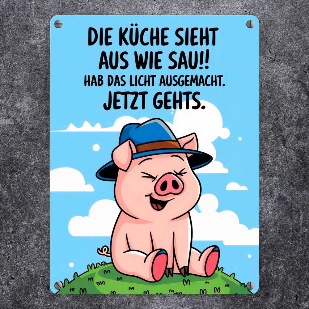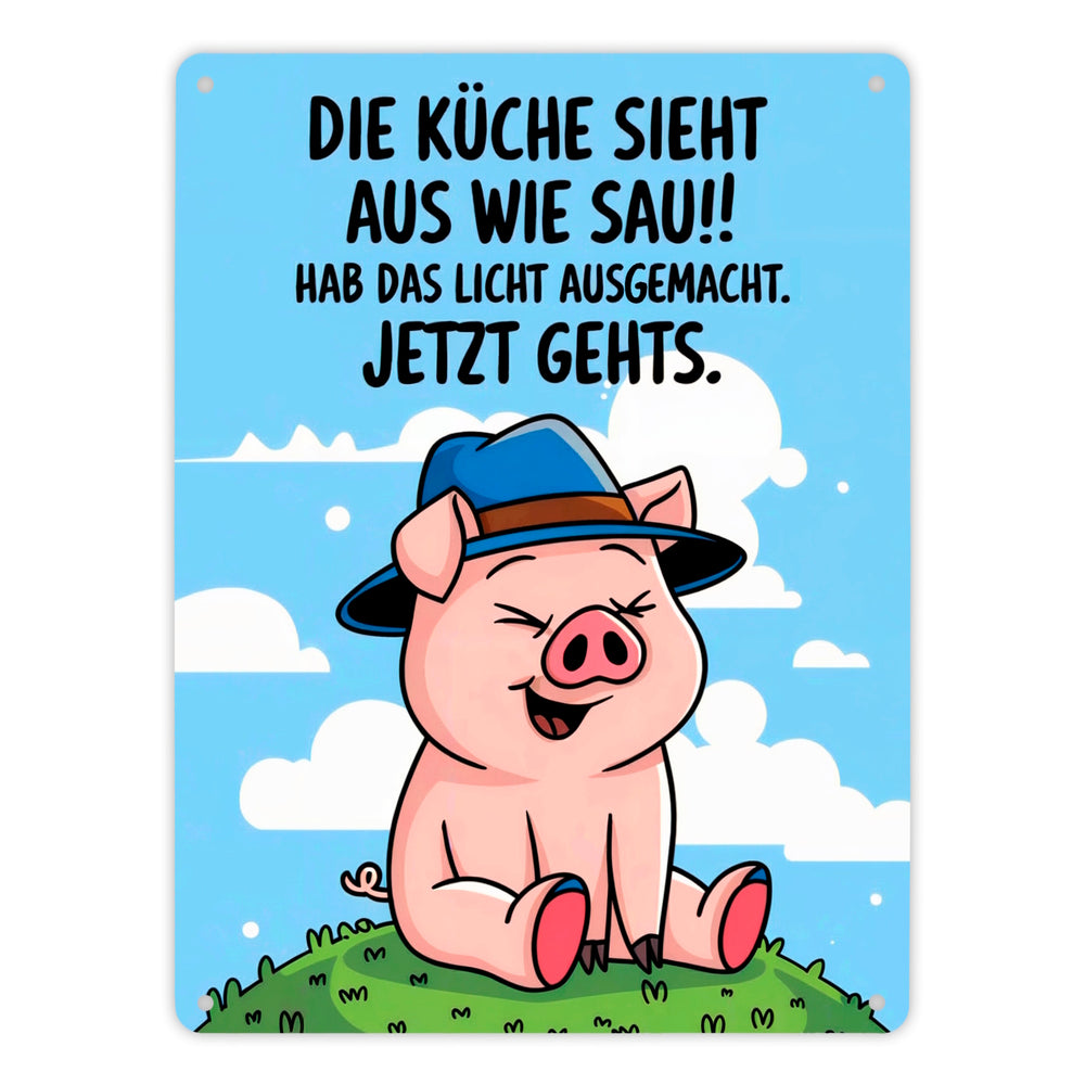 Schwein mit blauem Hut Metallschild in 15x20 cm - Küche sieht aus wie Sau