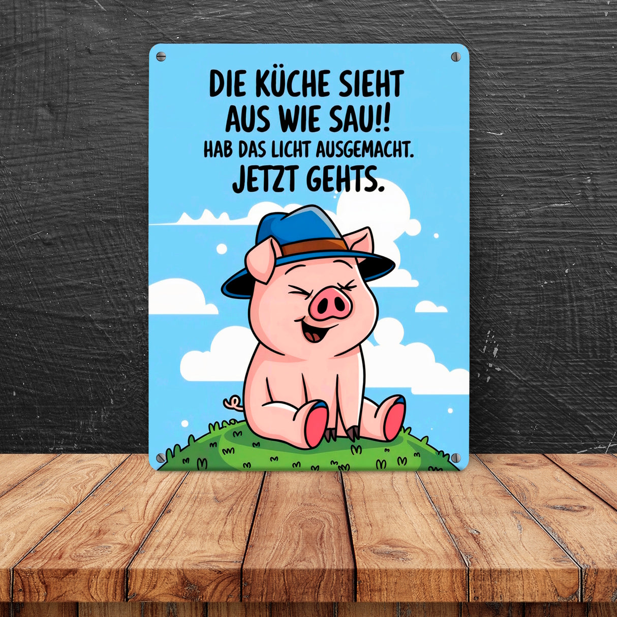 - Das Schwein mit blauem Hut Metallschild bringt Fröhlichkeit in deine Küche! Ein Cartoon-Schwein im modischen blauen Hut sitzt gemütlich auf grünem Gras.