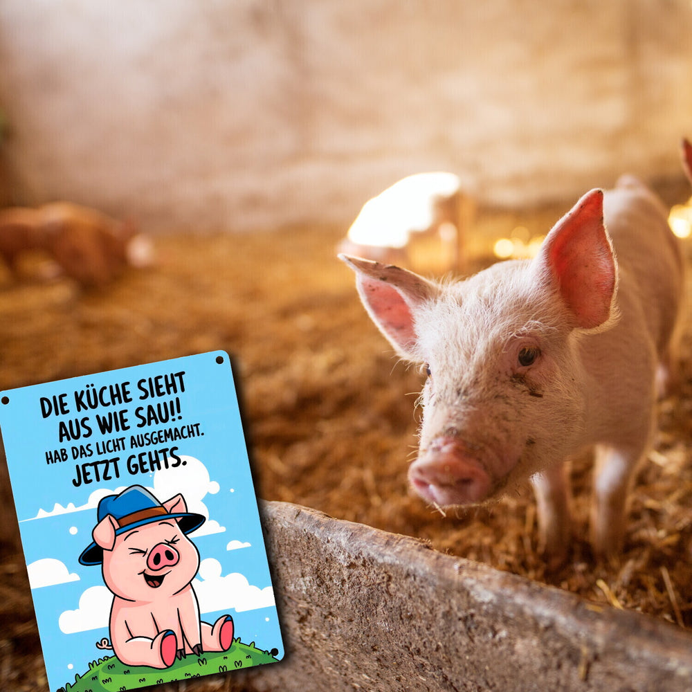 Schwein mit blauem Hut Metallschild in 15x20 cm - Küche sieht aus wie Sau - 15x20 cm ist auf Lager und wird versandt, sobald es wieder verfügbar ist