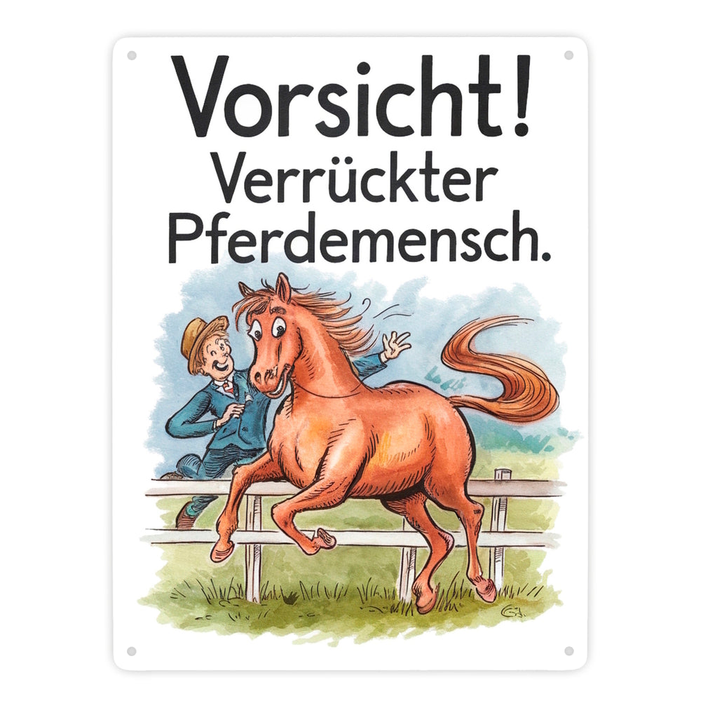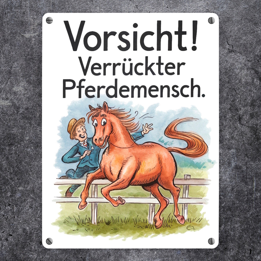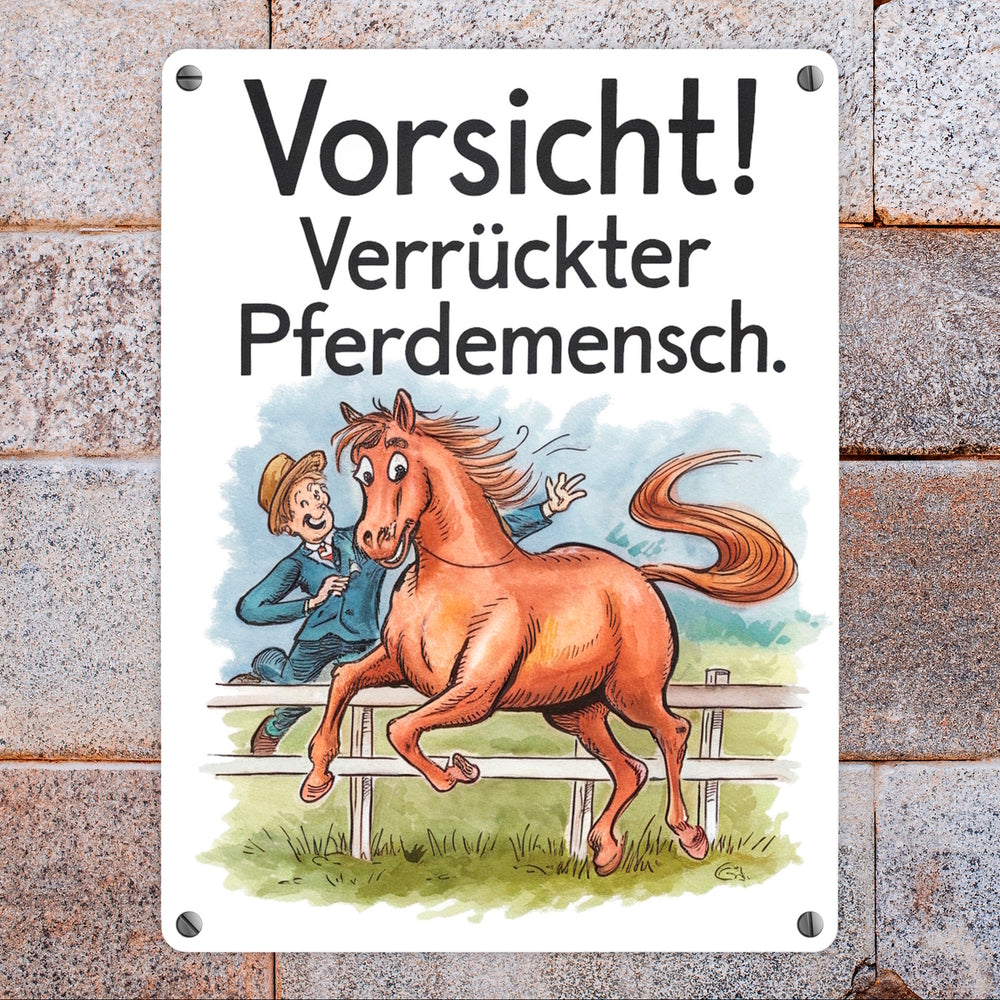 - Das Metallschild "Vorsicht! Verrückter Pferdemensch" besticht durch sein humorvolles Design. Auf einem weißen Hintergrund strahlen Pastellfarben und ein typografisches Aquarell. Im Zentrum steht der witzige Spruch, begleitet von einer cartoonartigen Figur und einem lustigen Pferd in einer lebhaften Outdoor-Kulisse.