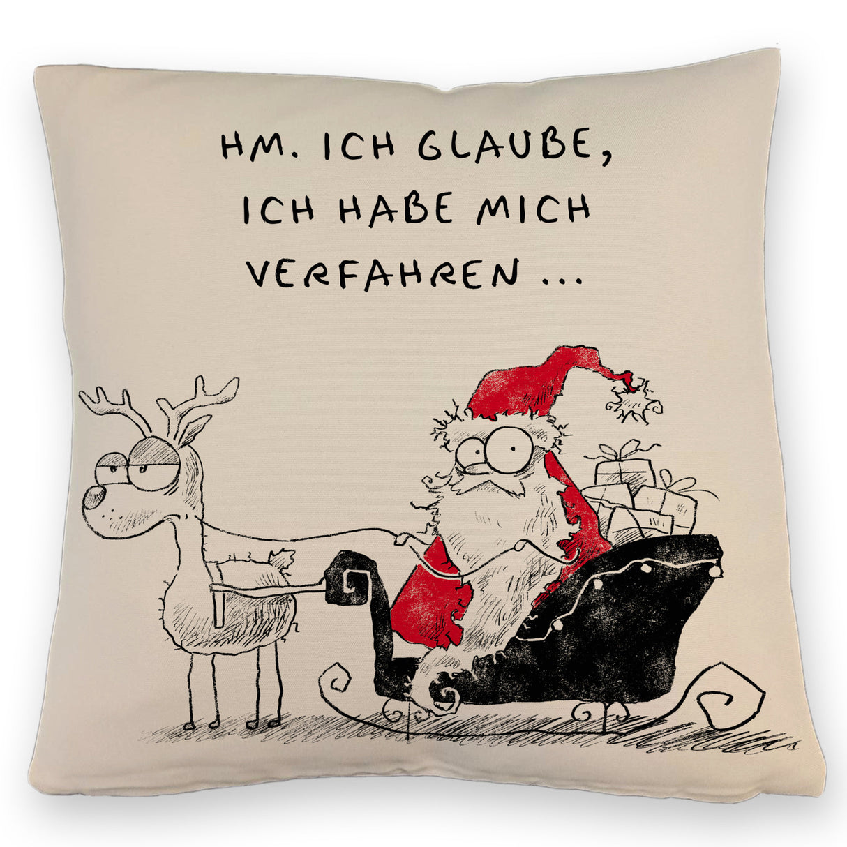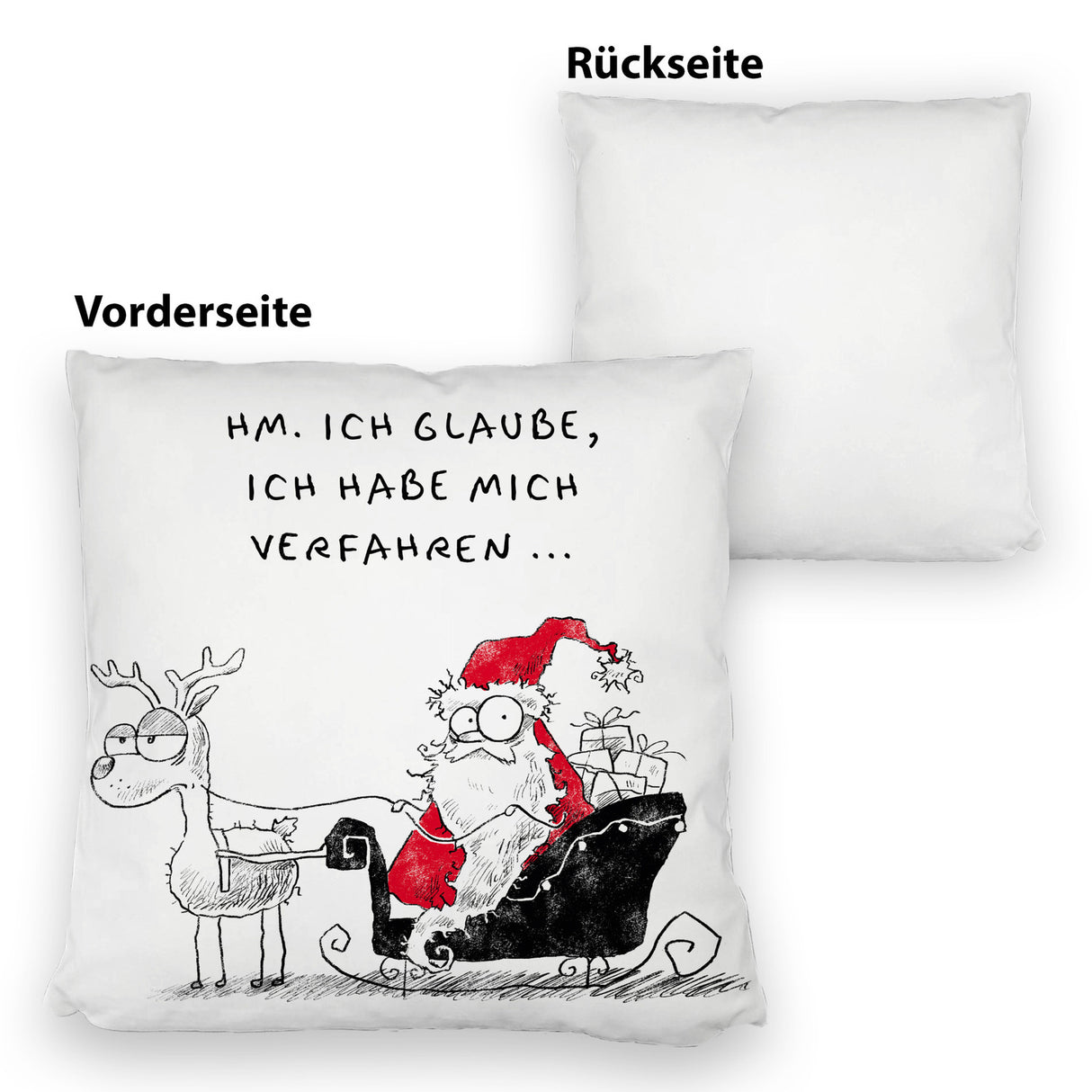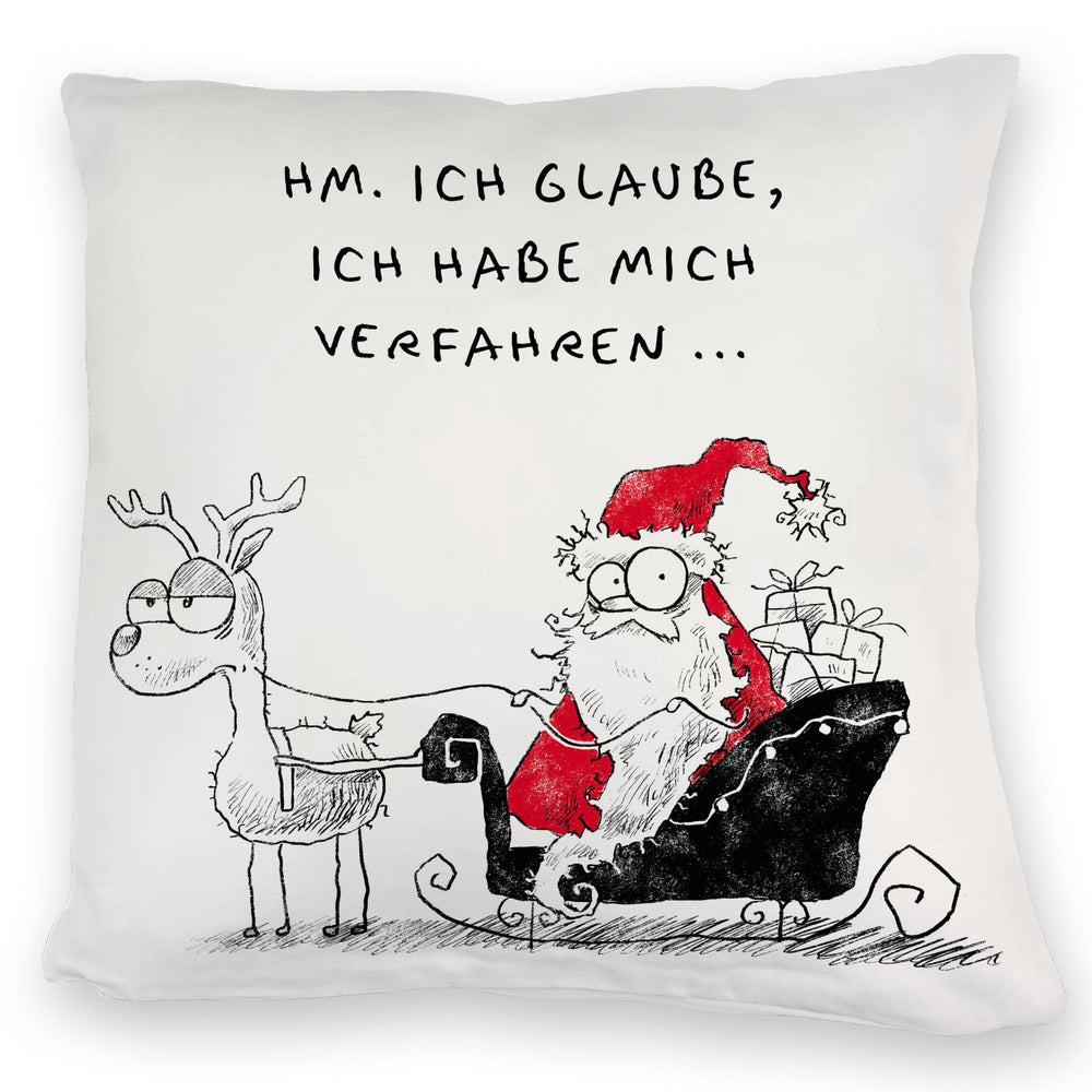 Weihnachtsmann im Schlitten Kissen mit Spruch Habe mich verfahren