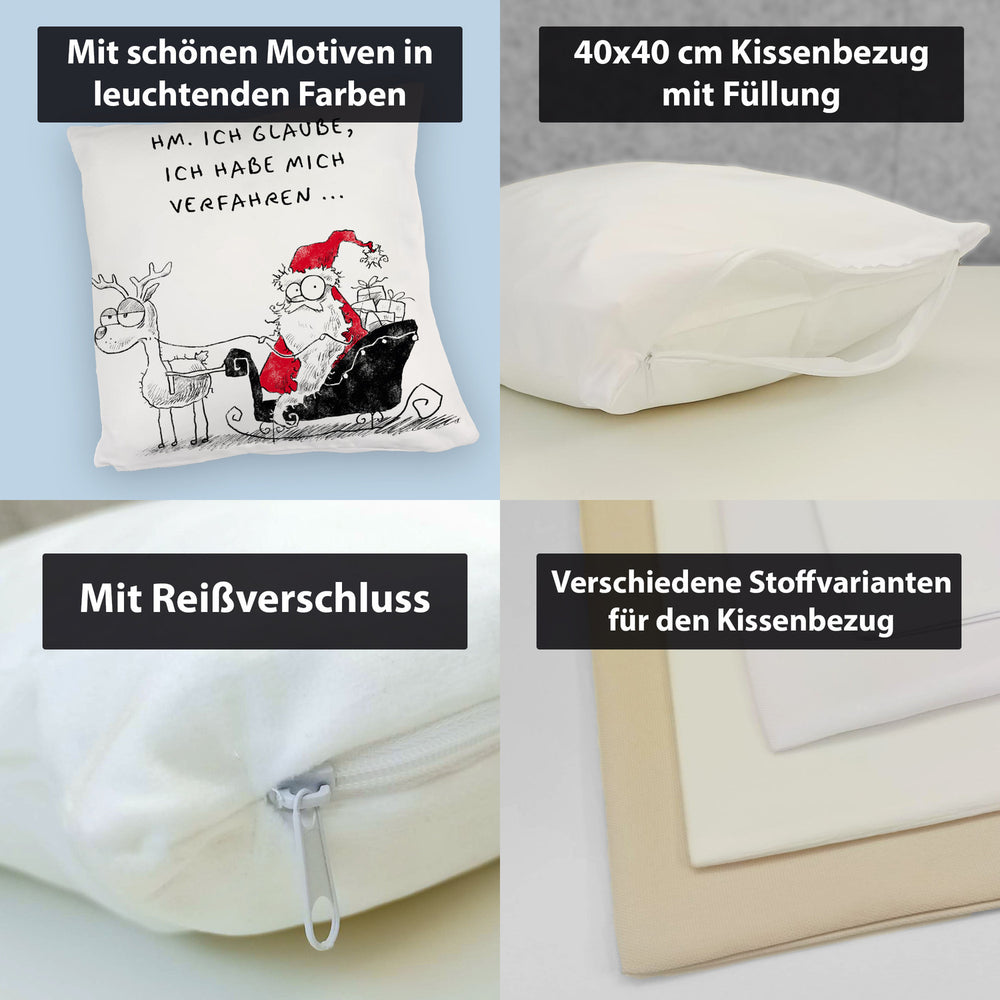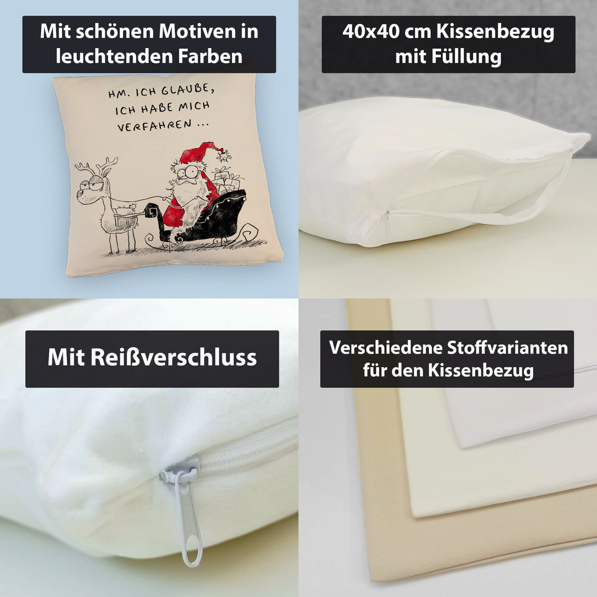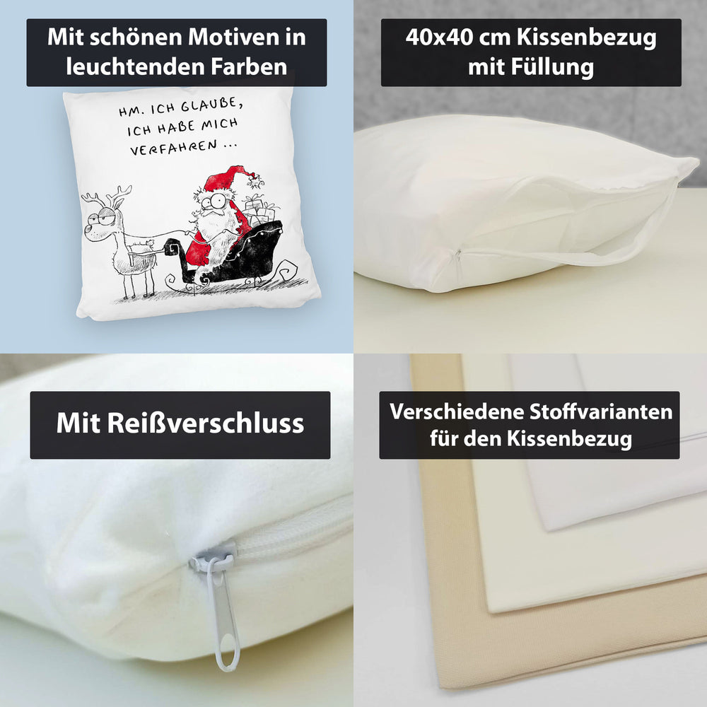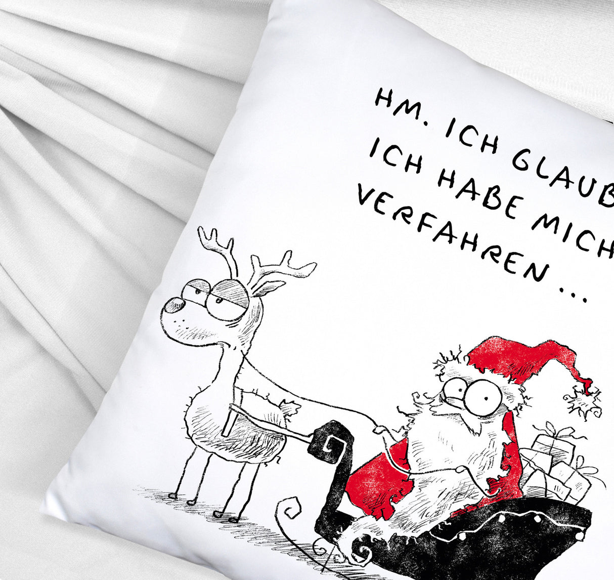 Weihnachtsmann im Schlitten Kissen mit Spruch Habe mich verfahren