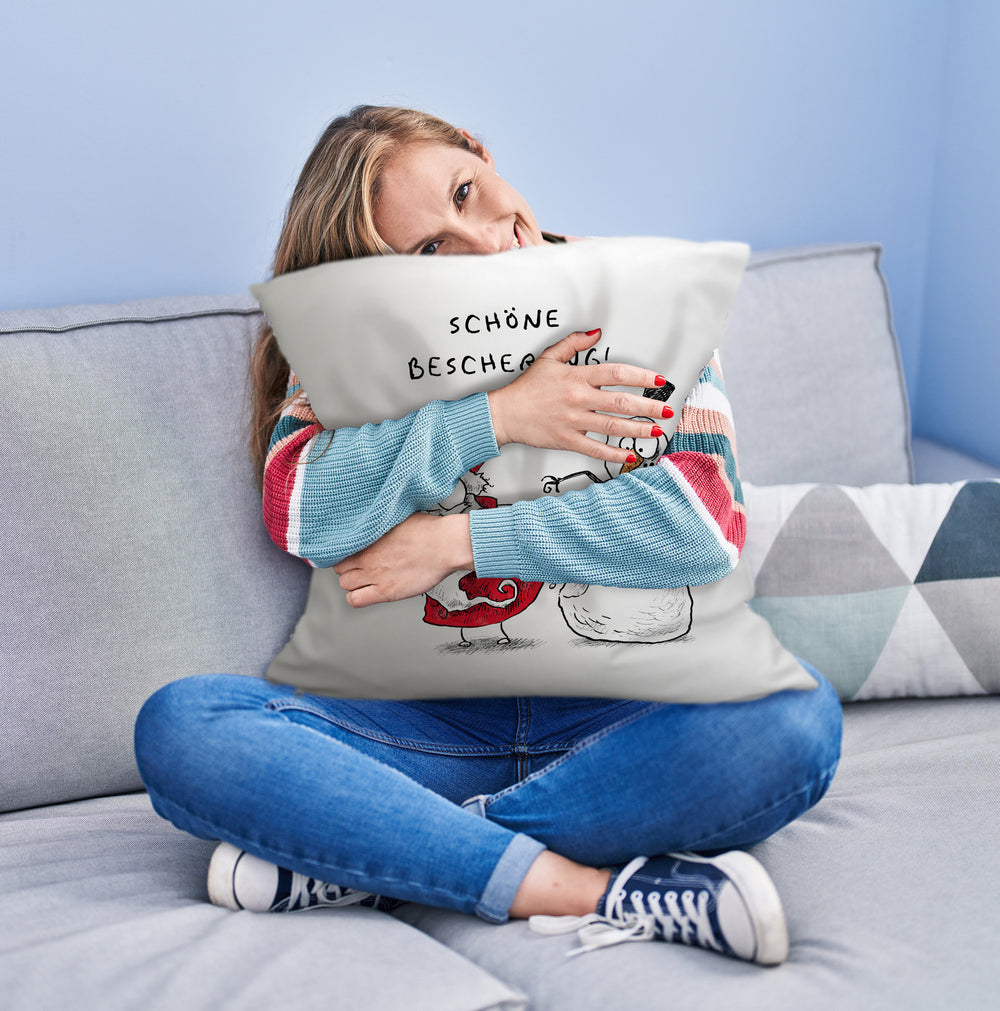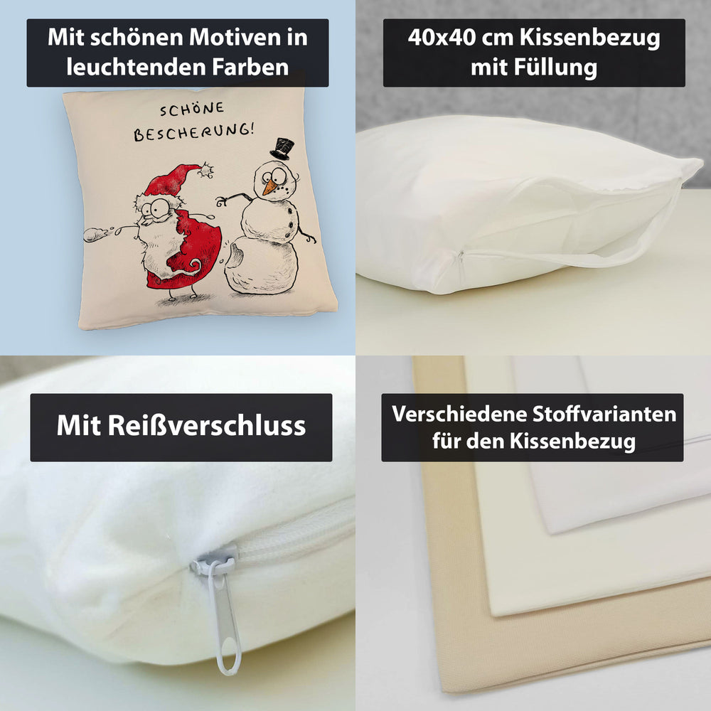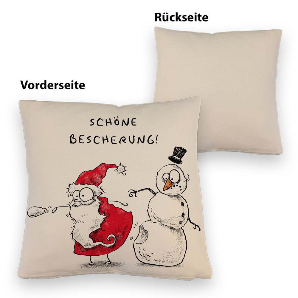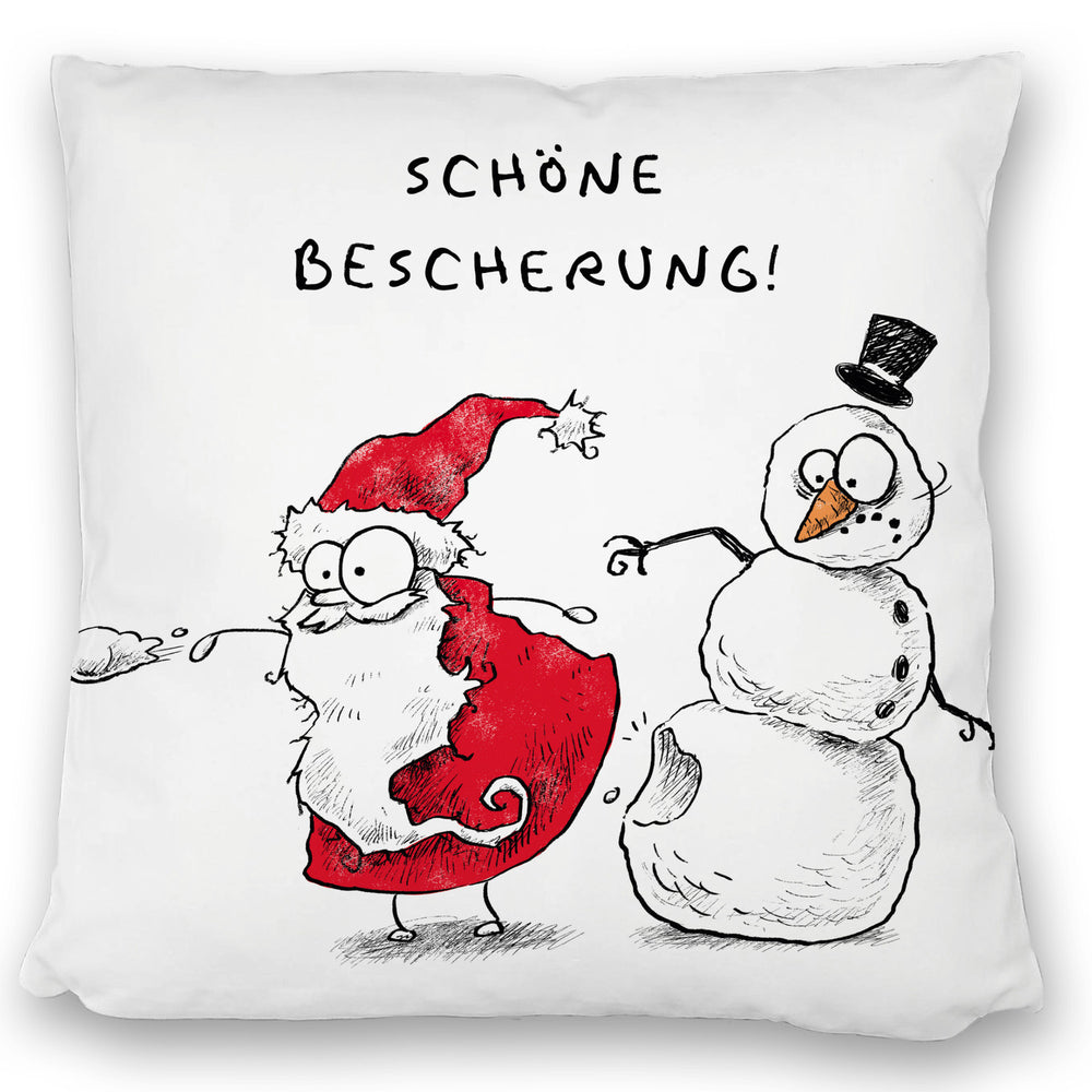 Weihnachtsmann und Schneemann Kissen mit Spruch Schöne Bescherung