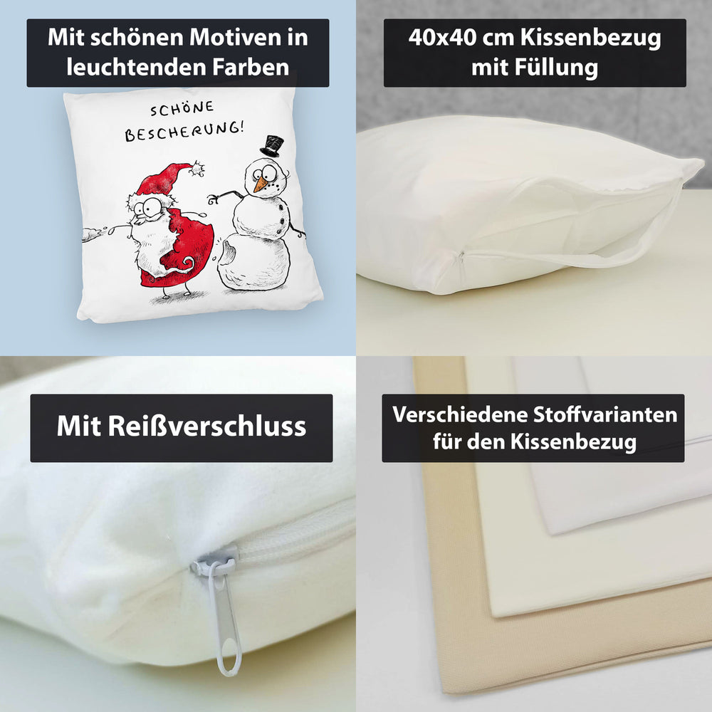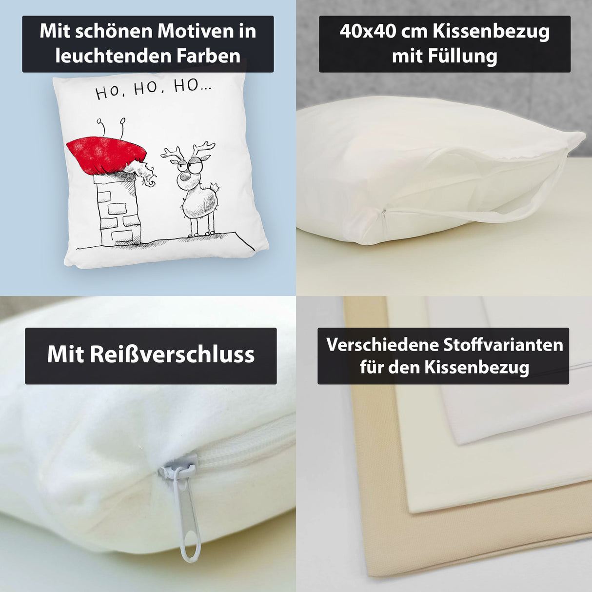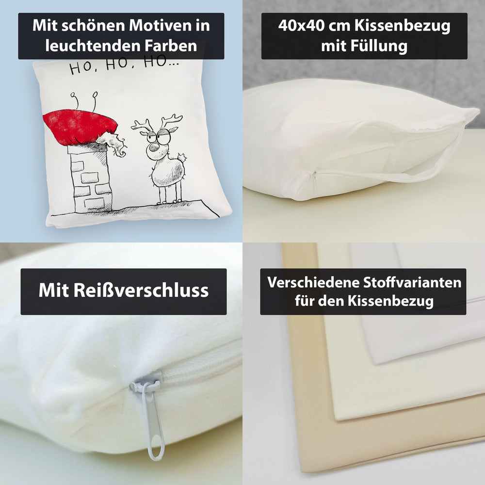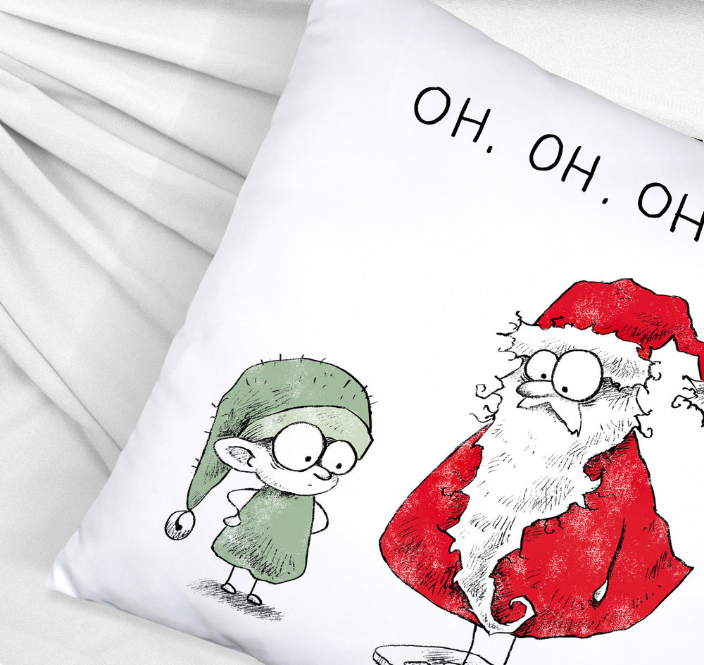 - Das lustige Kissen präsentiert einen Weihnachtsmann im Cartoon-Stil, der in verschiedenen Situationen seinen Job nicht richtig macht. Neben dem Weihnachtsmann sind auch ein Schneemann, ein Wichtel und ein Rentier abgebildet. Dieses Kissen ist ideal, um Dein Sofa oder Bett weihnachtlich zu dekorieren und gleichzeitig für ein paar Lacher zu sorgen.