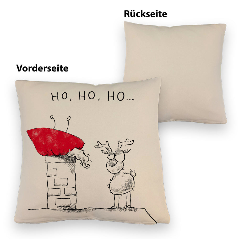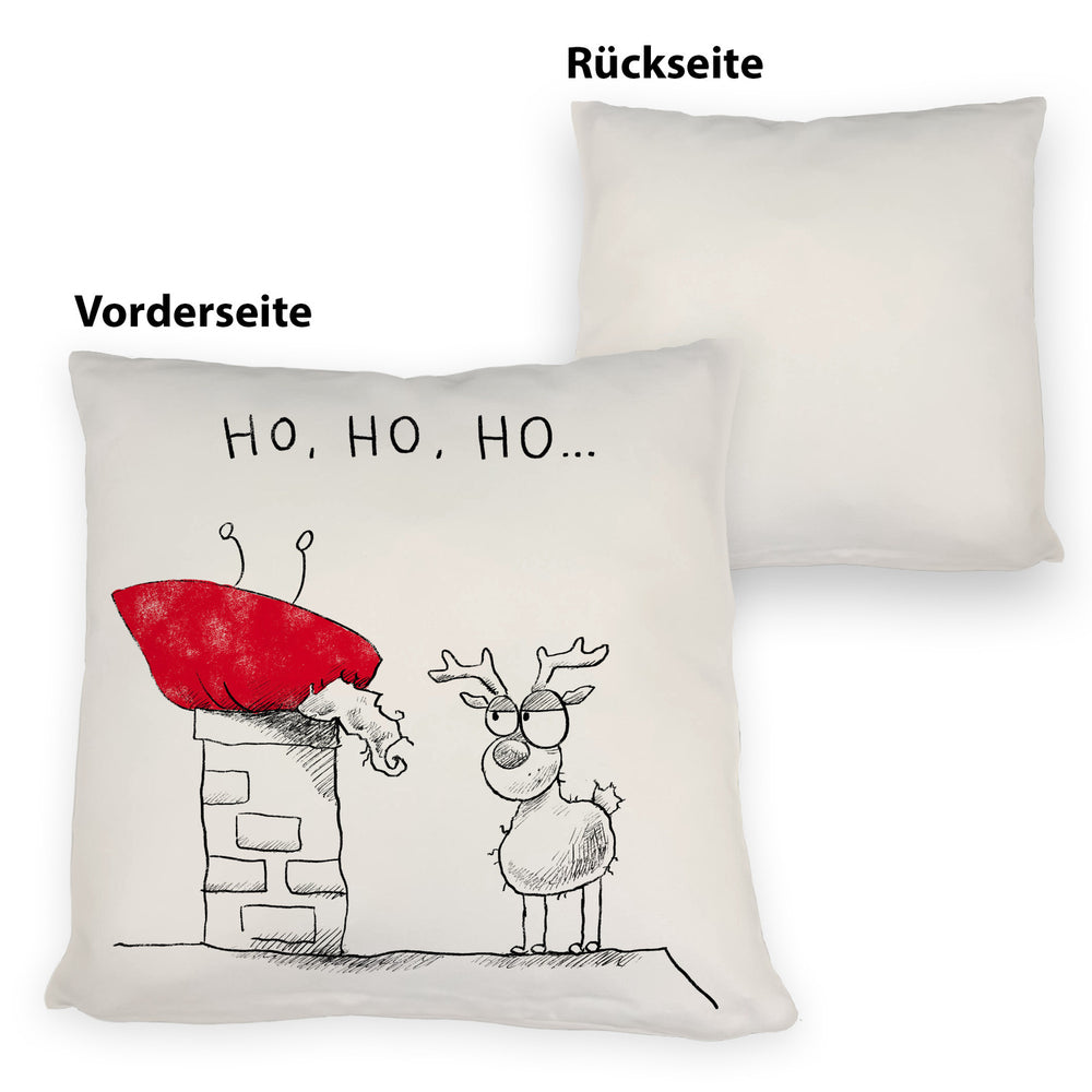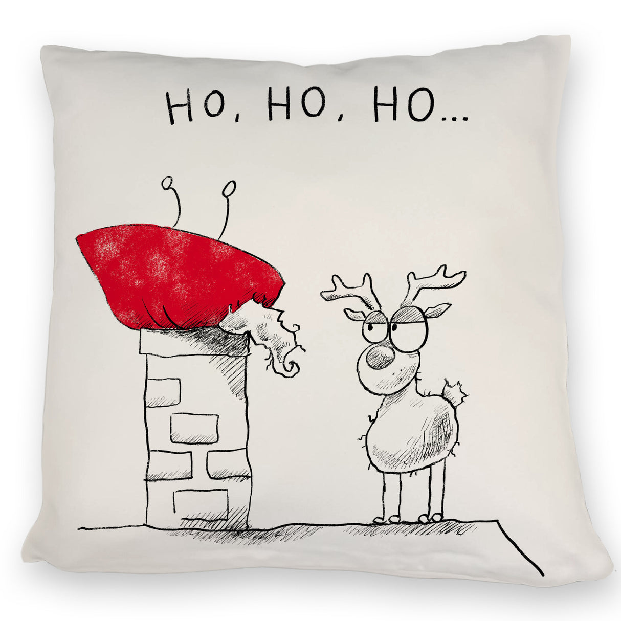 Weihnachtsmann im Kamin Kissen mit Spruch HO HO HO