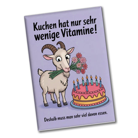 Wer hat gesagt, dass Kühlschrankmagnete langweilig sein müssen? Mit unserem skurrilen Ziege mit Torte Magnet bringen Sie nicht nur Farbe, sondern auch Humor in Ihre Küche! Die niedliche Ziege mit ihren großen Augen und der langen Schnauze, die auf einem fröhlich hellvioletten Untergrund tanzt, ist ein absoluter Hingucker. Wer könnte widerstehen, wenn sie einen Blumenstrauß im Maul hält und neben einer farbenfrohen Geburtstagstorte thront? Der clevere Spruch „KUCHEN hat nur sehr wenige Vitamine! Deshalb muss man SEHR viel davon essen.“ ist ein spielerischer Bauchklatscher für jeden, der eine Liebe für Süßes pflegt und gleichzeitig einen guten Sinn für Humor hat. Dieser Magnet ist für jeden geeignet, der seinen Kühlschrank, seine Pinnwand oder jede andere metallische Oberfläche mit einem kleinen Stückchen Spaß aufpeppen möchte. Ob jung oder alt, Kuchenliebhaber oder einfach nur jemand, der ein Lächeln in den Alltag bringen möchte – der Ziege mit Torte Magnet hebt die Laune und zaubert jedem Betrachter ein Schmunzeln ins Gesicht. Perfekt, um Einkaufslisten oder wichtige Notizen am Kühlschrank festzuhalten, ohne dabei den Spaß zu vergessen. Warum dieses Produkt nicht verschenken? Es ist das ideale kleine Mitbringsel für Geburtstage, Einweihungspartys oder einfach als Überraschung für zwischendurch. Der Magnet ist ein kreatives und originelles Geschenk, das sicherlich in Erinnerung bleibt und immer wieder ein Lächeln auslöst. Ein echter Gesprächsstarter und das perfekte Souvenir für alle, die gerne über lustige und skurrile Dinge lachen. Machen Sie einen geliebten Menschen glücklich und tragen Sie dazu bei, dass die Welt ein klein wenig bunter und humorvoller wird!