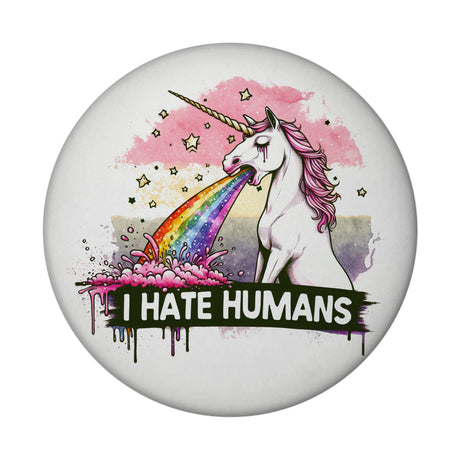 Einhorn kotzt Regenbogen Magnet rund mit Spruch I hate Humans