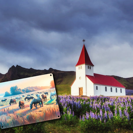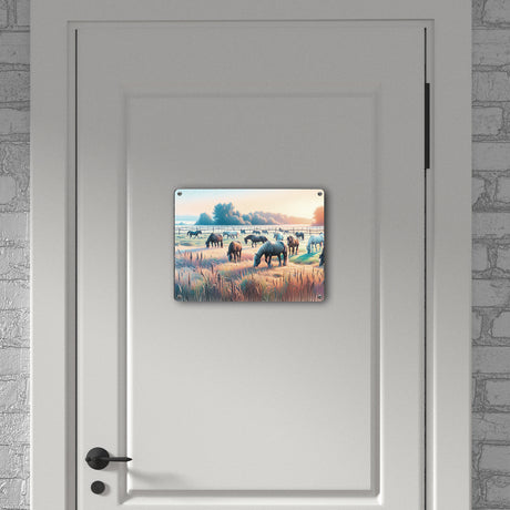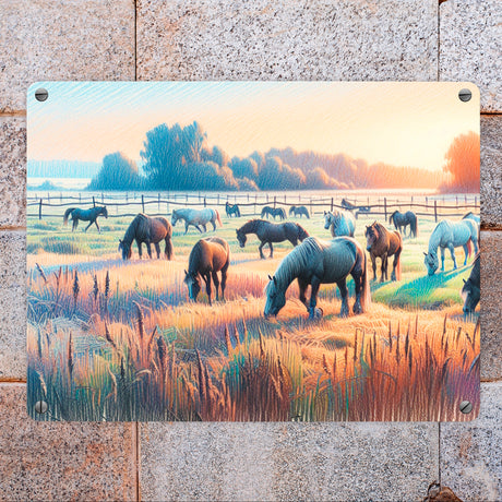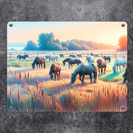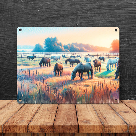 Ab €8,95Grundpreis /Nicht verfügbarAuf LagerPferde auf Koppel bei Sonnenaufgang Metallschild in 15x20 cm