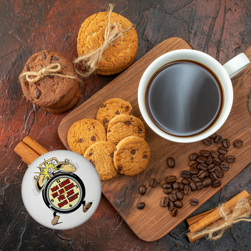 - Dieser runde Magnet zeigt einen vibrierenden, comic-haften Wecker mit witzigen Comicfüßchen, der von einer Comichand betätigt wird. Der humorvolle Spruch "Das Leben ist zu kurz für 'hat noch Zeit!'" rundet das Design ab. Perfekt für alle, die Humor und Kreativität schätzen.