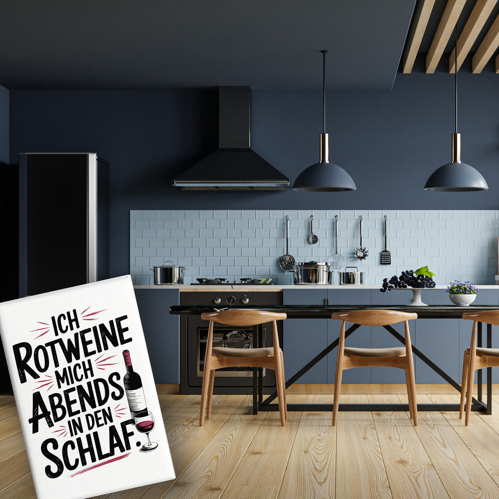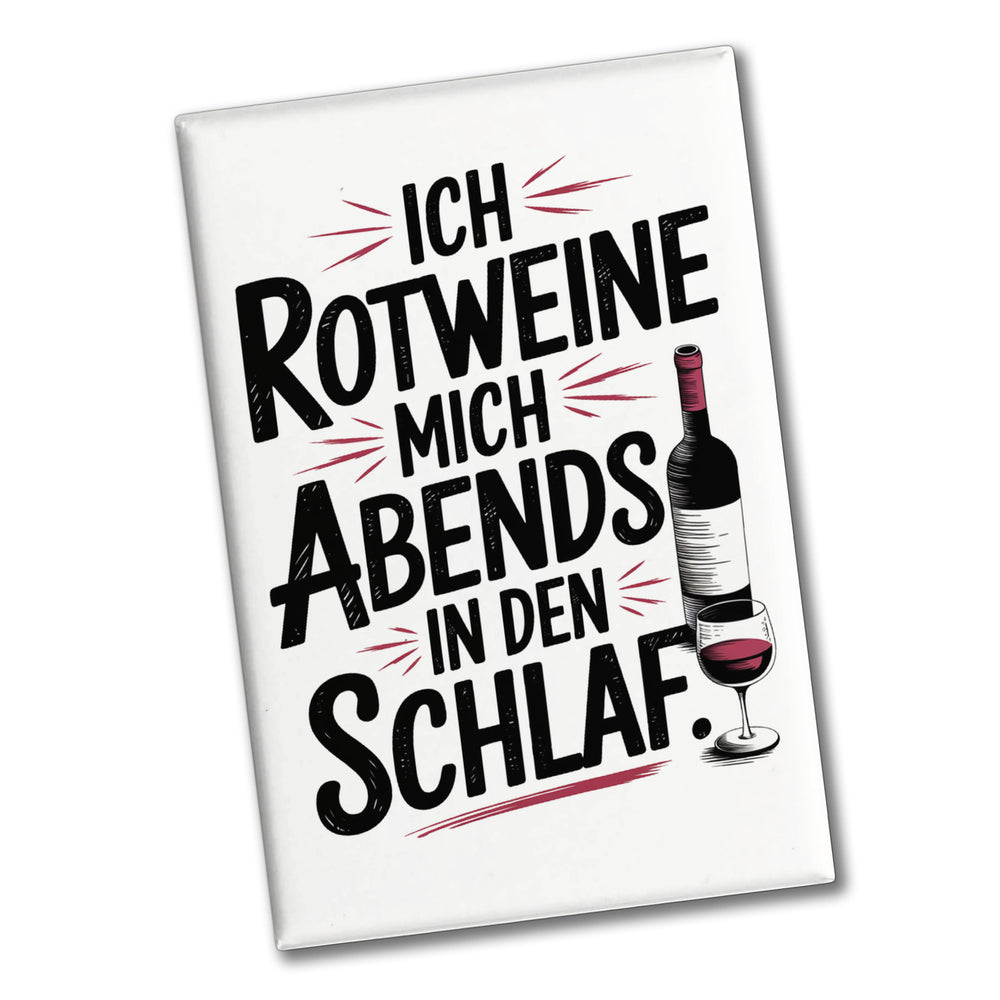 Dieser eckige Magnet zeigt eine humorvolle Illustration auf weißem Hintergrund. Eine charmant handgezeichnete Rotweinflasche und ein Glas begleiten den verspielten Spruch: "Ich rotweine mich abends in den Schlaf". Perfekt für alle, die Wein und ei Hinweise: Größe: ca. 8x5,5 cm