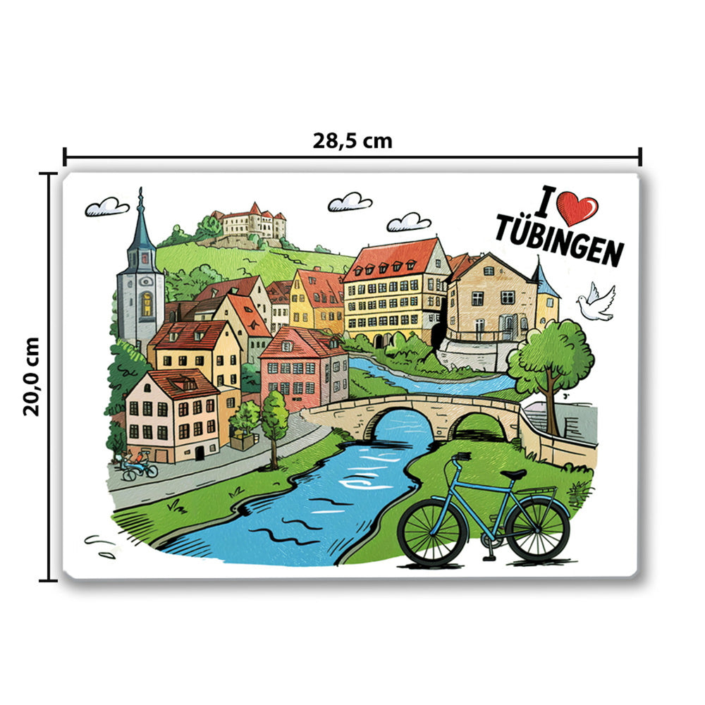 - Entdecken Sie das liebevoll gestaltete "I love Tübingen" Schneidebrett! Dieses Glas-Schneidebrett ist mit einem Herz, der berühmten Stiftskirche, dem Hölderlin-Turm und dem Schloss Hohentübingen in einem niedlich bunten Comic-Look verziert. Eine weiße Taube verleiht dem Design den letzten Schliff - ein charmantes Highlight für jede Küche.