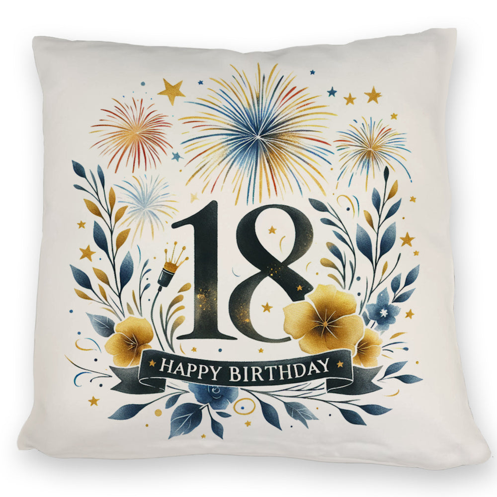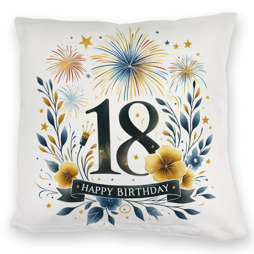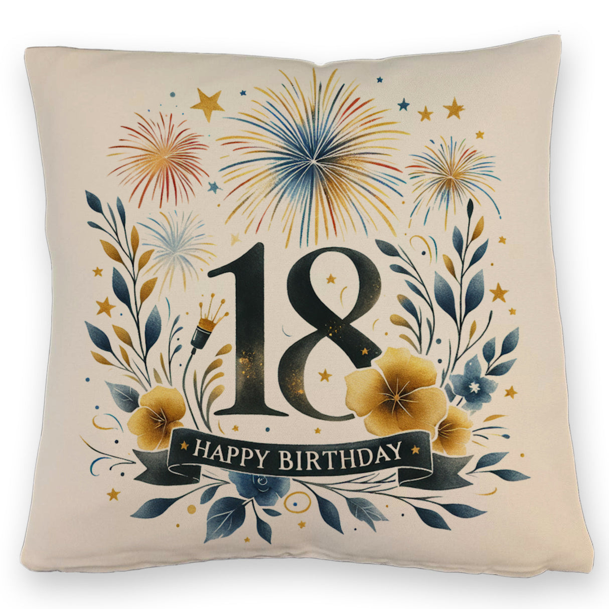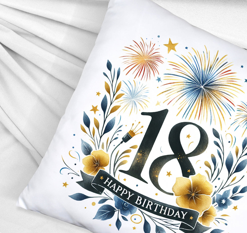 • Happy Birthday zum 18. – Das Kissen, das lauter „Party!“ schreit als der DJ! Mit einem farbenfrohen Feuerwerk und gelben Blumen ist dieses Kissen der perfekte Hingucker für jede Party.