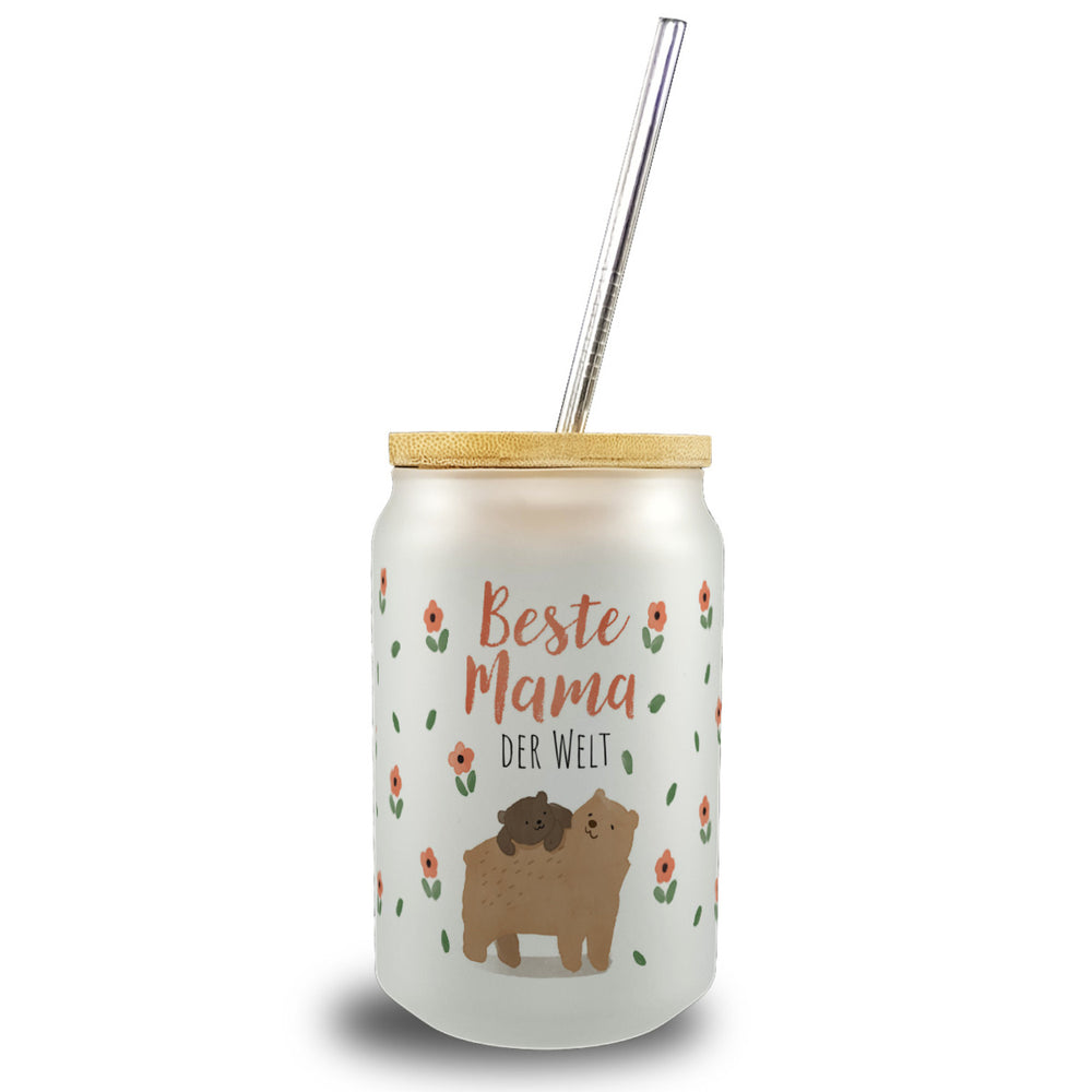 Bären-Mutter mit Kind Trinkglas mit Bambusdeckel mit Spruch Beste Mama der Welt