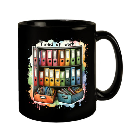 Aktenordner im Büro Tasse in Schwarz mit Spruch Tired of work