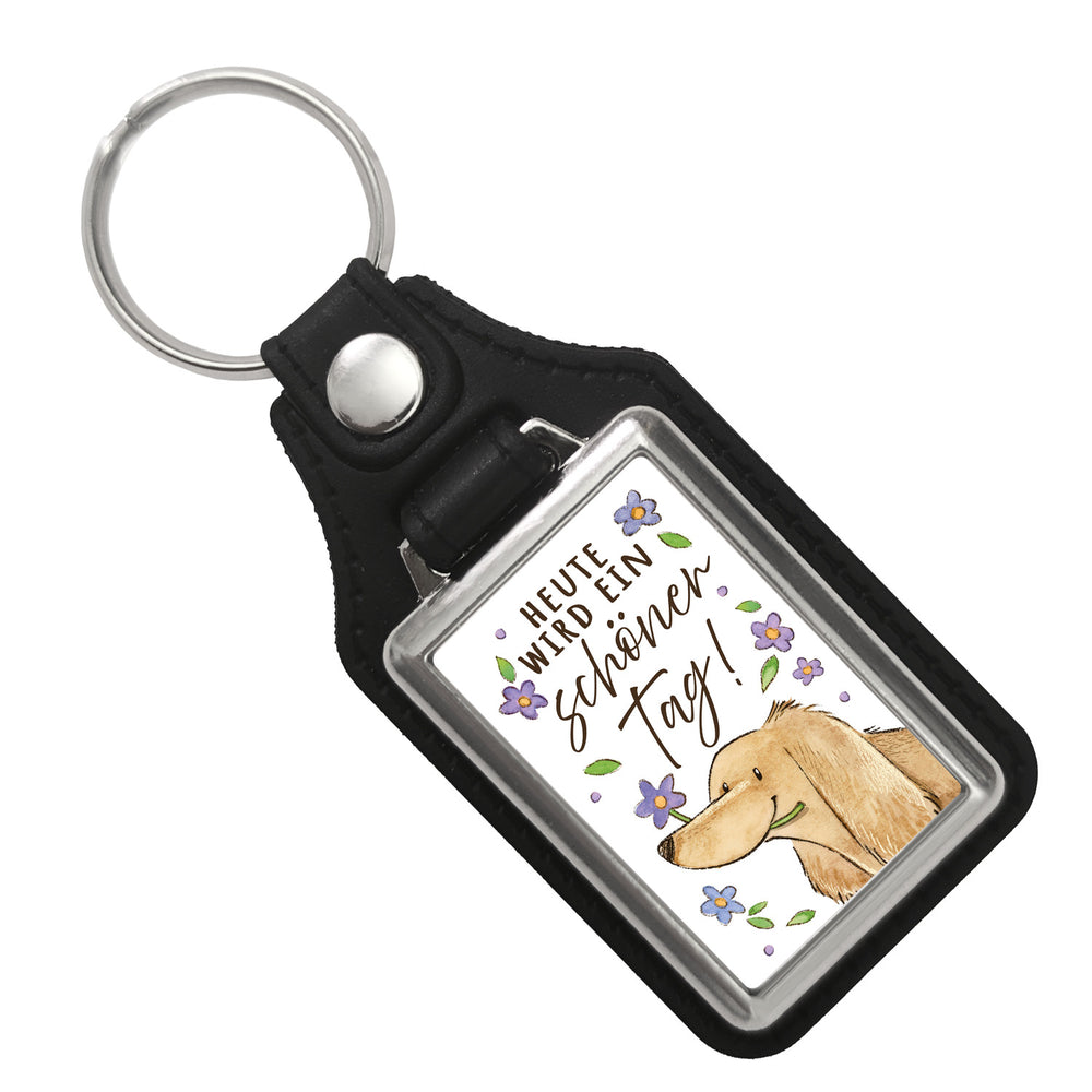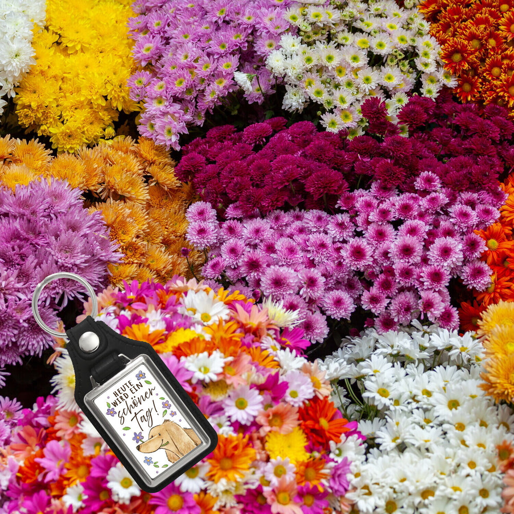 Dackel mit Blume Schlüsselanhänger mit Spruch Heute wird ein schöner Tag