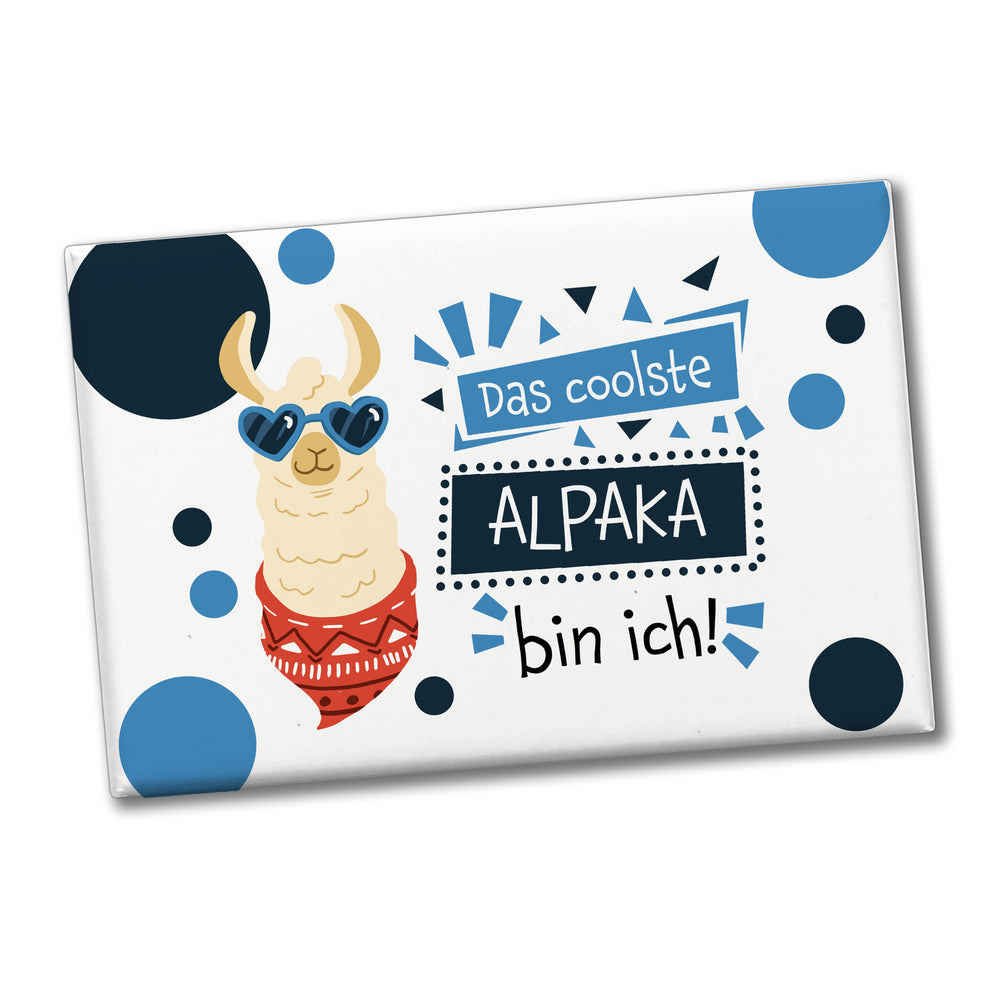 - Auf dem Magnet steht der Text: Das coolste Alpaka bin ich. Als Motiv ist ein Alpaka mit Sonnenbrille und Halstuch zu sehen. Der Hintergrund ist weiß mit blauen Punkten und Dreiecken als Verzierung.