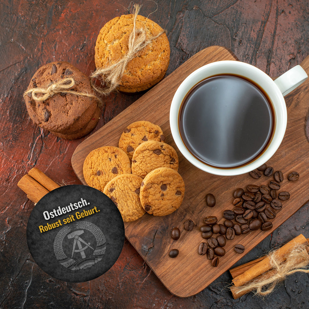 - Der DDR-Stolz Magnet ist rund und zeigt einen grauen, betonfarbenen Hintergrund, der an die Architektur der DDR erinnert. In der Mitte erkennst du ein subtil integriertes DDR-Logo-Wasserzeichen. Der lustige Spruch "Ostdeutsch. Robust seit Geburt" macht diesen Magneten zu einem echten Hingucker für alle Ostalgie-Fans!