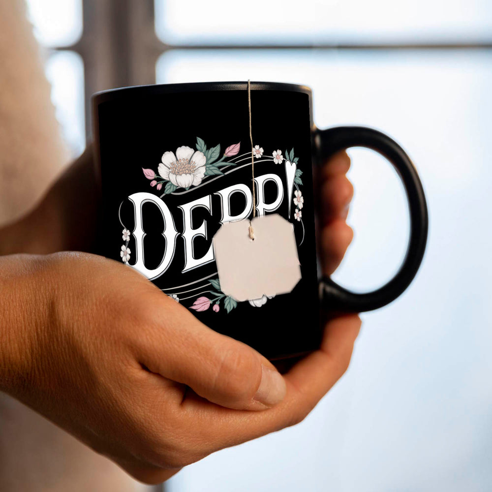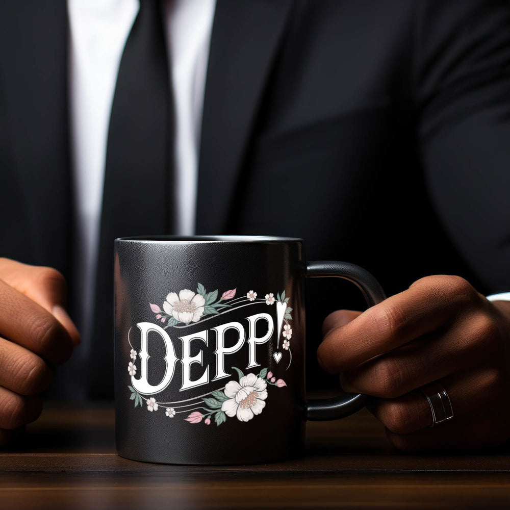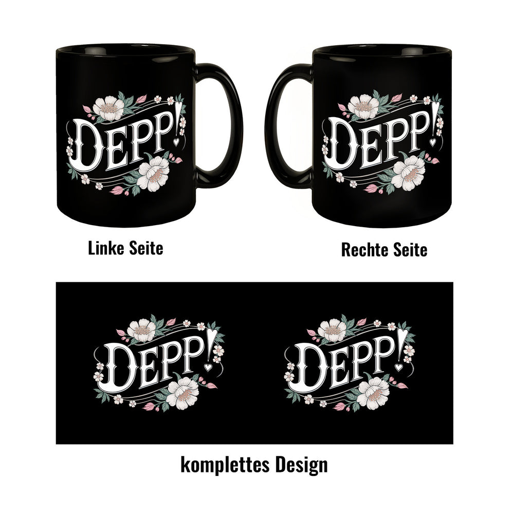 - Diese Tasse ist eine Ode an alle Deppe mit Stil! Mit dem Wort 'Depp!' in Weiß und einem coolen Schatteneffekt sticht sie auf schwarzem Hintergrund hervor. Die Buchstaben e und p verwandeln sich in Herzformen und werden von floralen Ornamenten in Vintage-Stil umrahmt. Ein Muss für humorvolle Teetrinker!