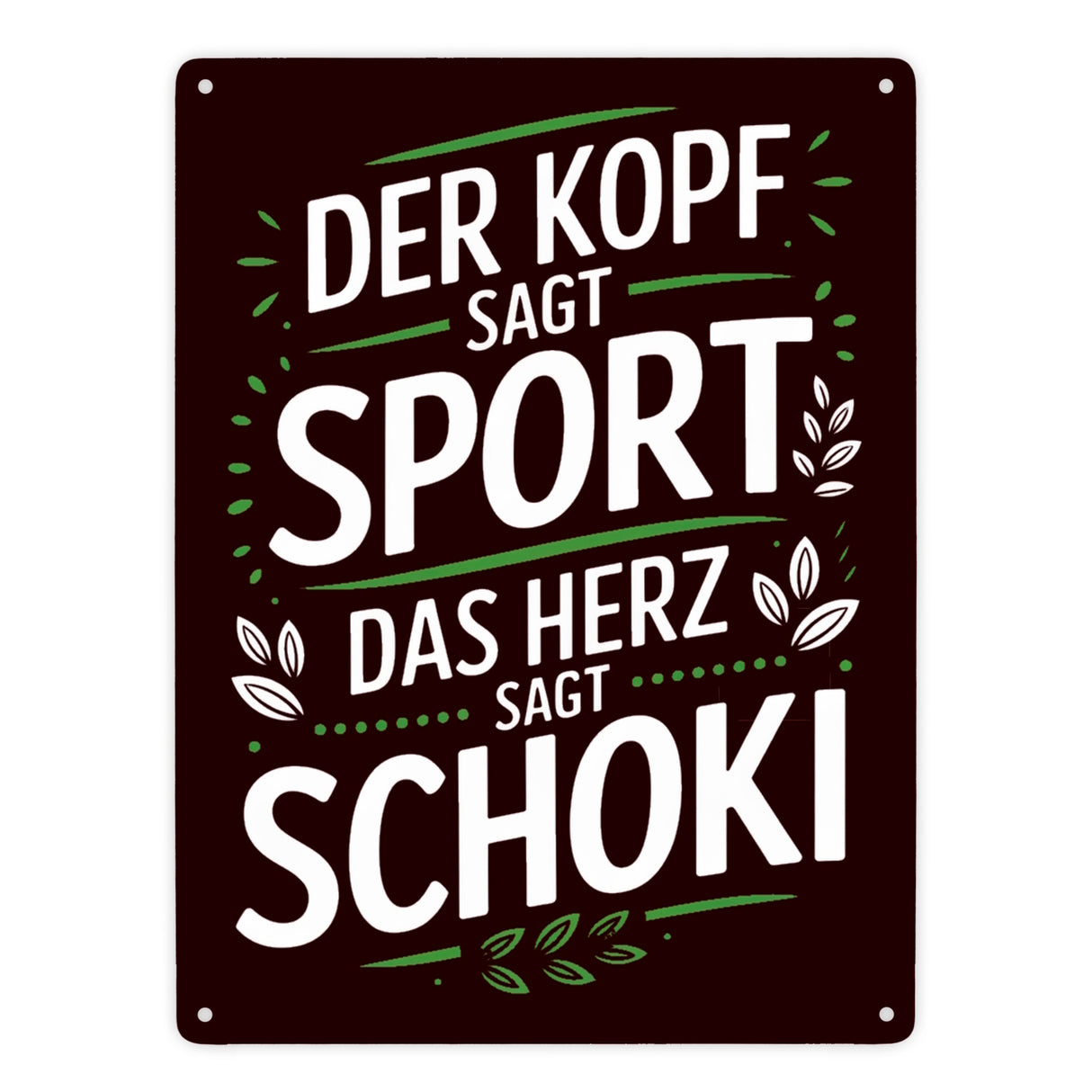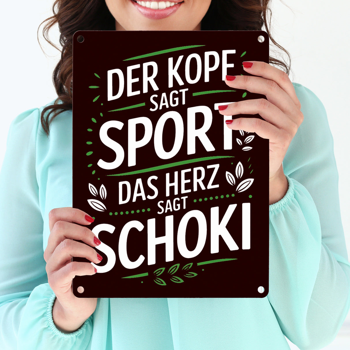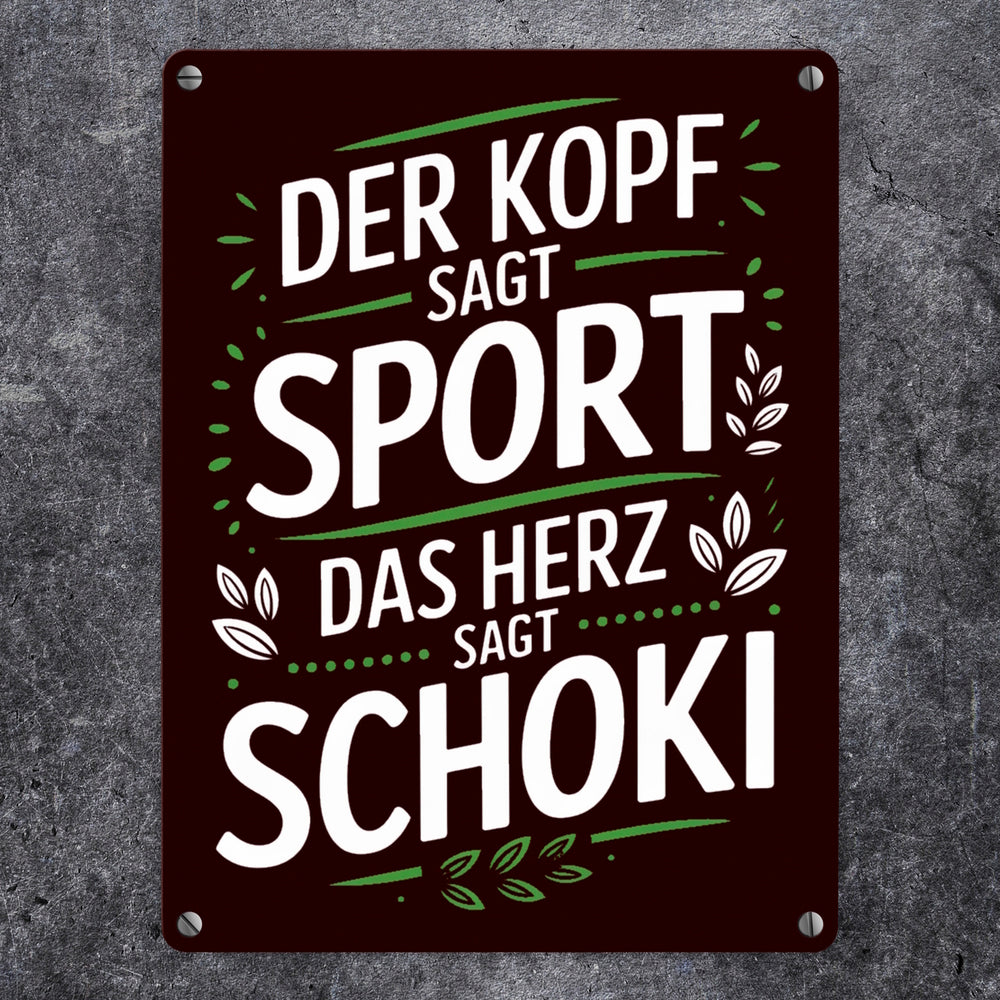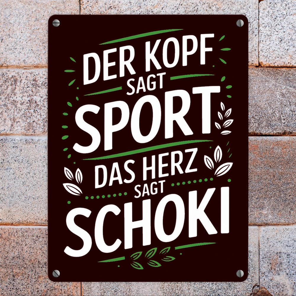 Der Kopf sagt Sport das Herz sagt Schoki Metallschild in 15x20 cm