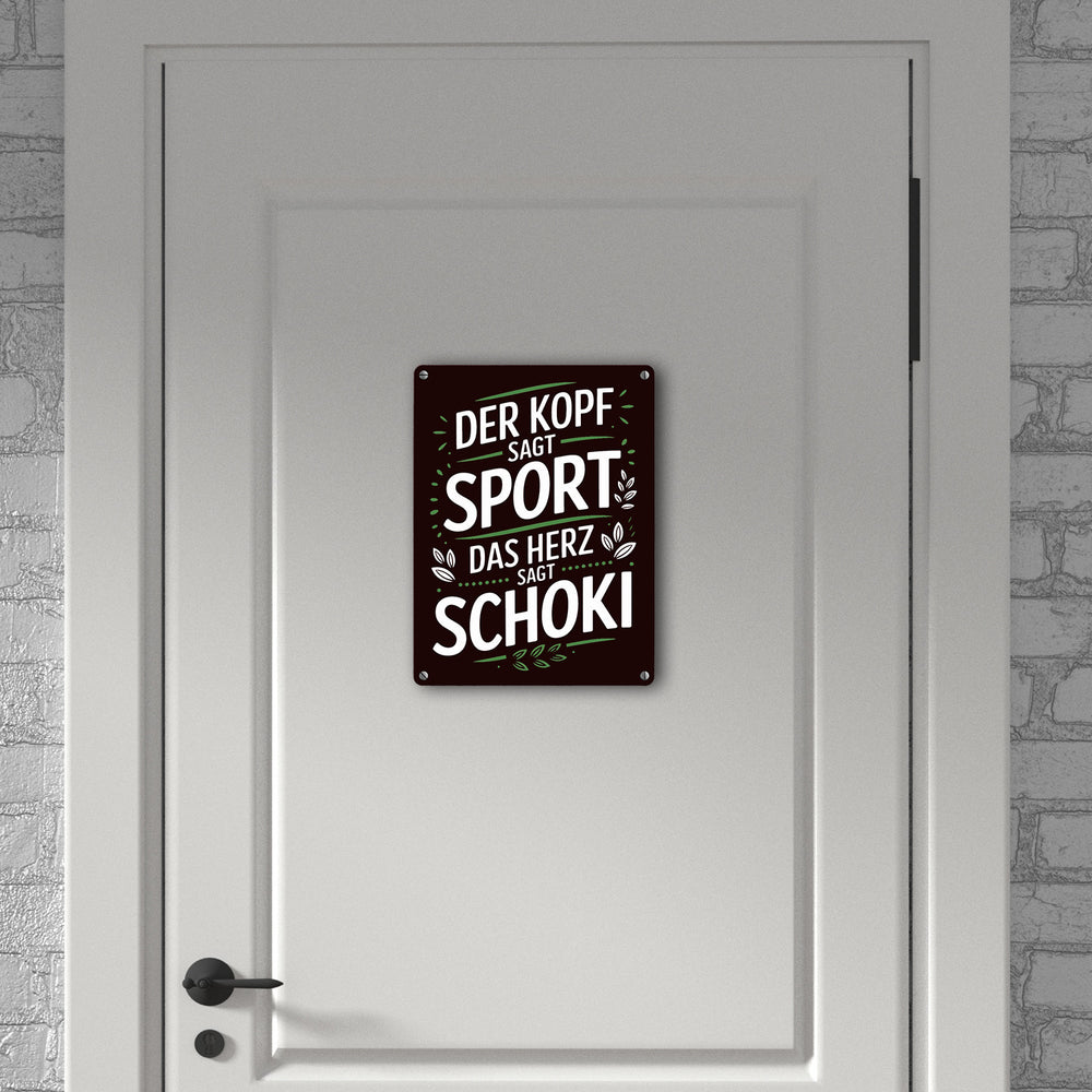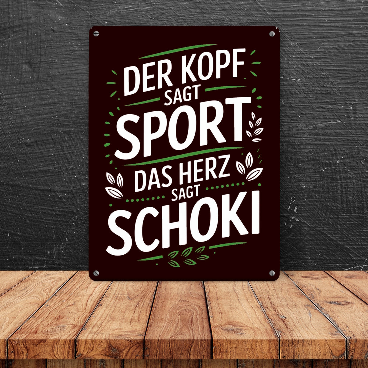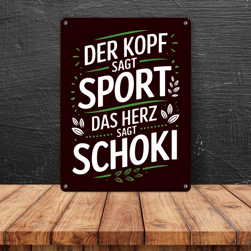 - Stell dir vor: Dein Kopf ruft nach Sport, aber dein Herz flüstert verführerisch "Schoki" – auf diesem schicken Metallschild! Der dunkle Hintergrund und der weiße, humorvolle Text machen es zu einem Hingucker.