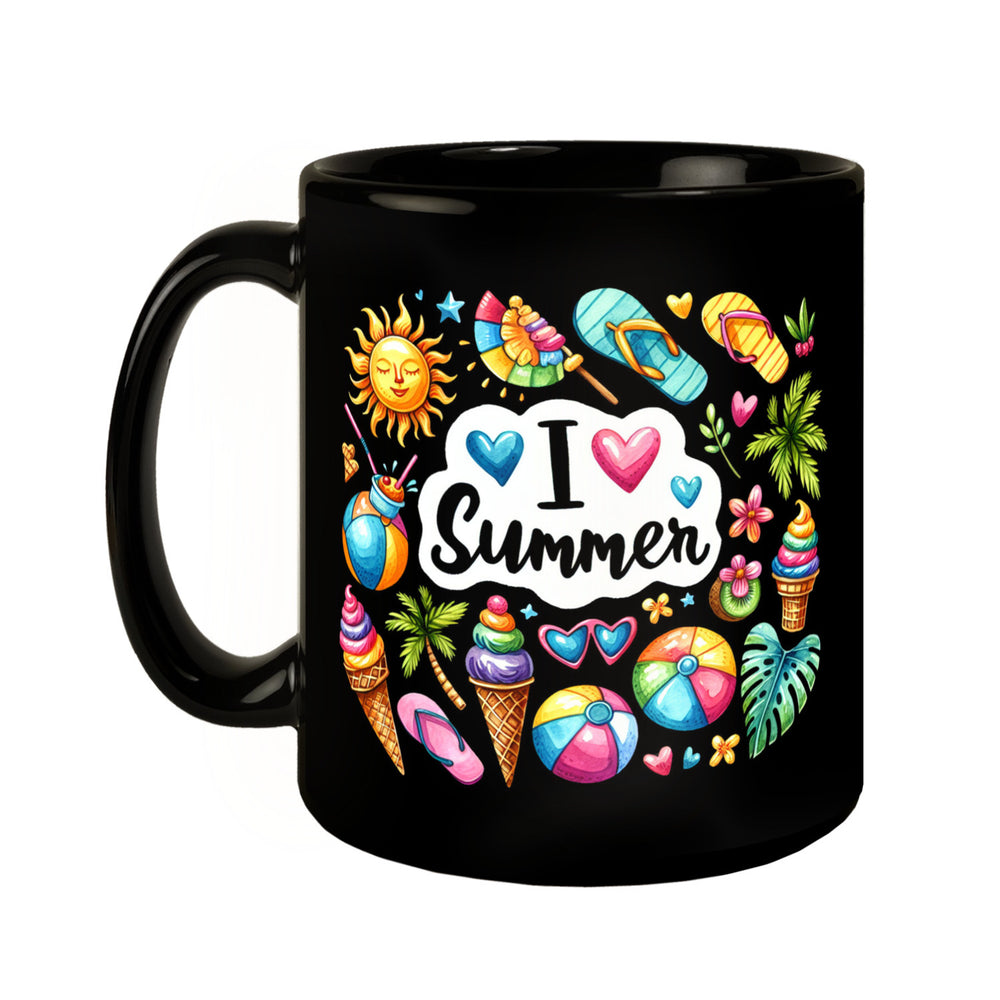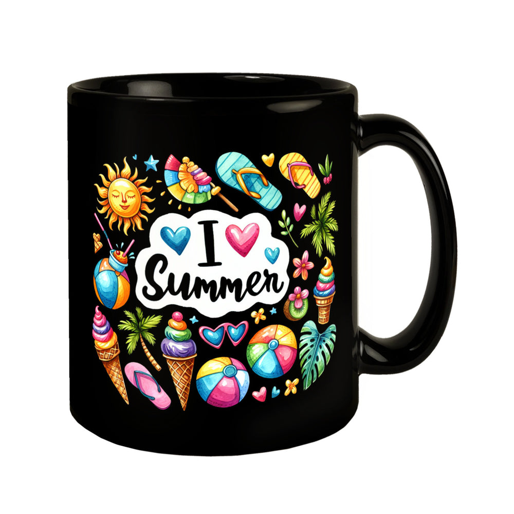 - Starten Sie in Ihren Tag mit der Endlich Sommer Tasse in Schwarz! Der bunte Spruch "I love Summer" zaubert ein Lächeln auf jedes Gesicht.