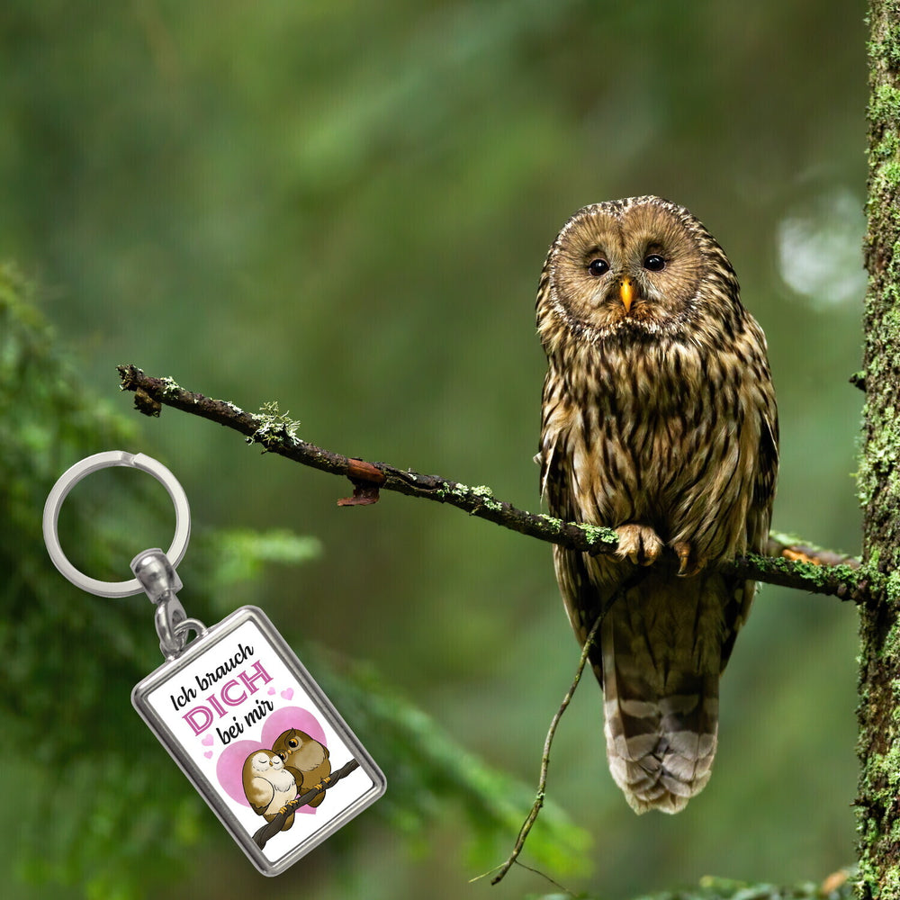 - Verliebt, verknuddelt und bereit für den Schlüsselbund! Das Eulenpaar Schlüsselanhänger zwitschert den süßen Spruch „Ich brauch Dich bei mir“ direkt ins Herz. Perfekt für Turteltauben, die ihre Nester verzieren und nie ohne ein Stückchen Liebe losflattern wollen.