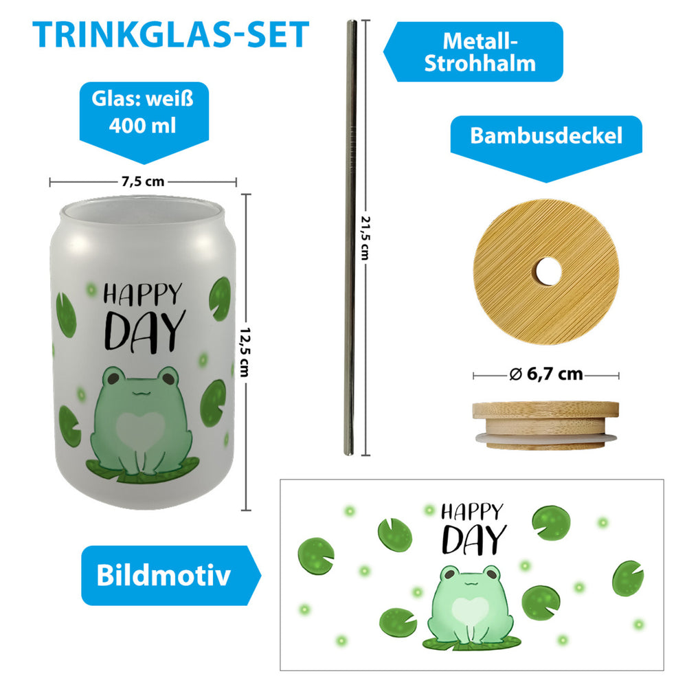 - Lieferumfang: 1x Frosch Trinkglas mit Bambusdeckel mit Spruch Happy Day