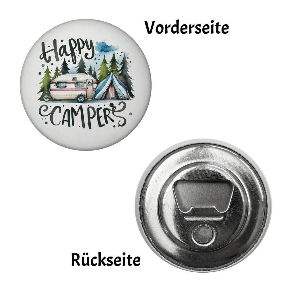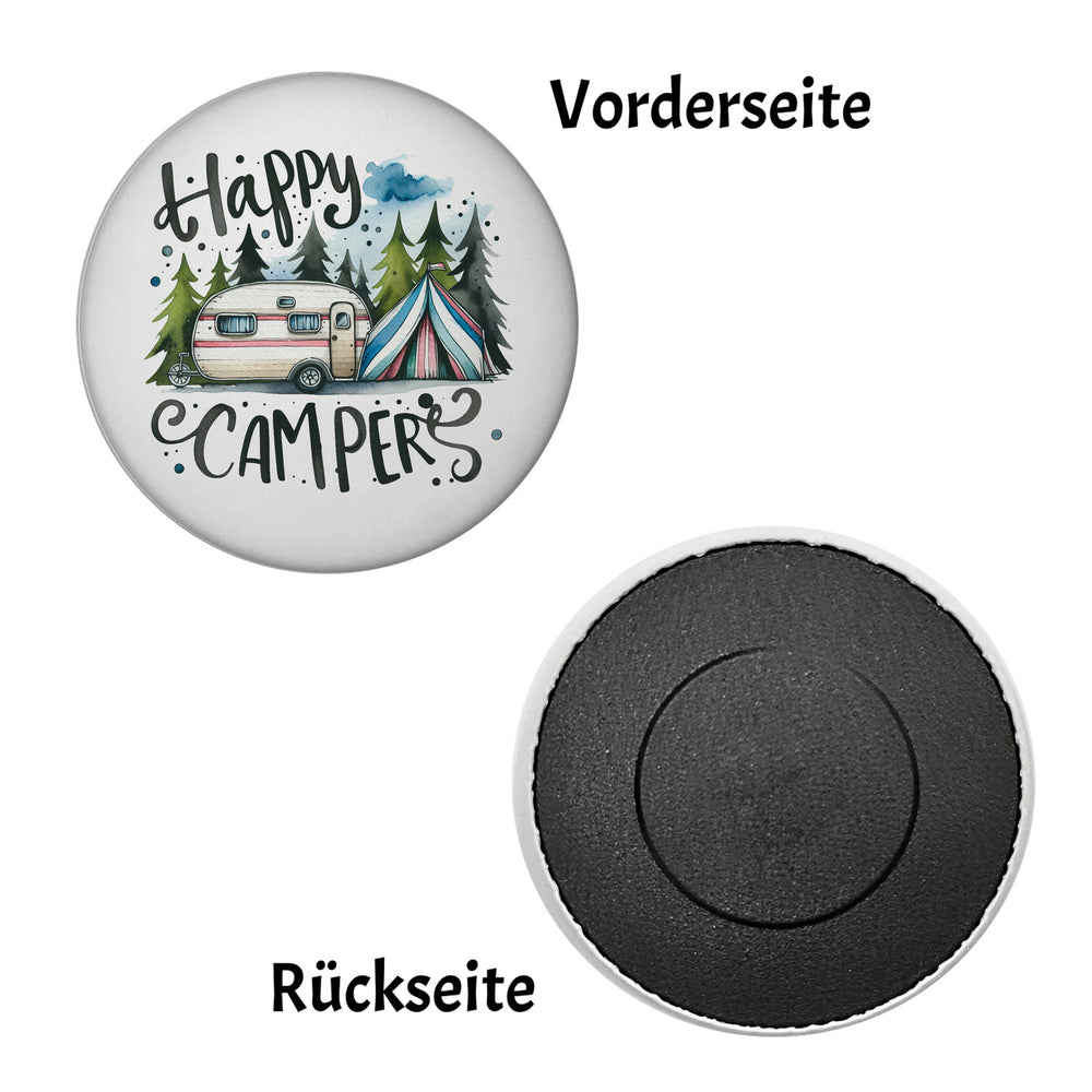 • Hast du den Campingwagen vollgepackt und bist bereit für das nächste Abenteuer? Unser runder Magnet "Happy Campers" ist genau das Richtige für echte Frischluftfanatiker! Mit einem fröhlichen Wohnwagen und einem bunten Zelt im Wald bringt er den Camping-Witz direkt auf deinen Kühlschrank!
