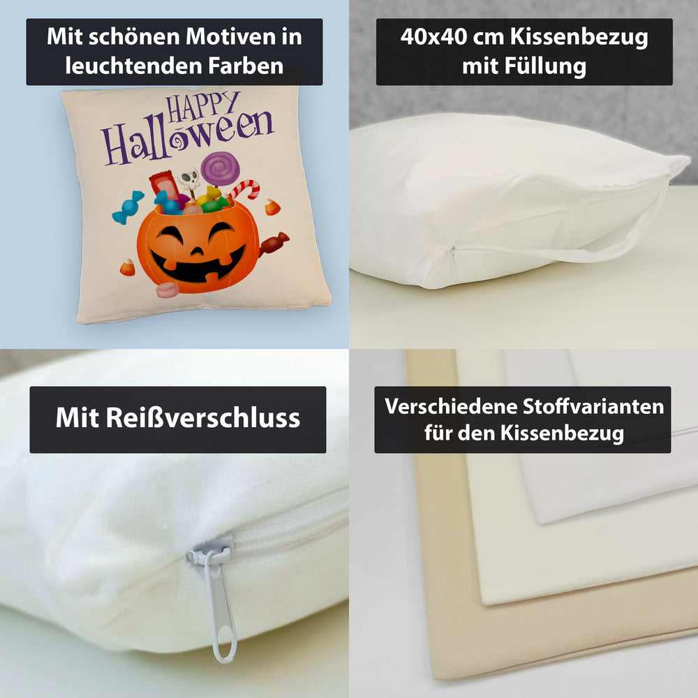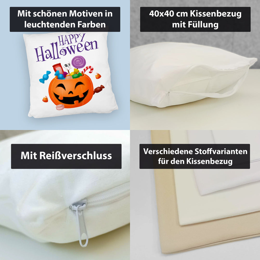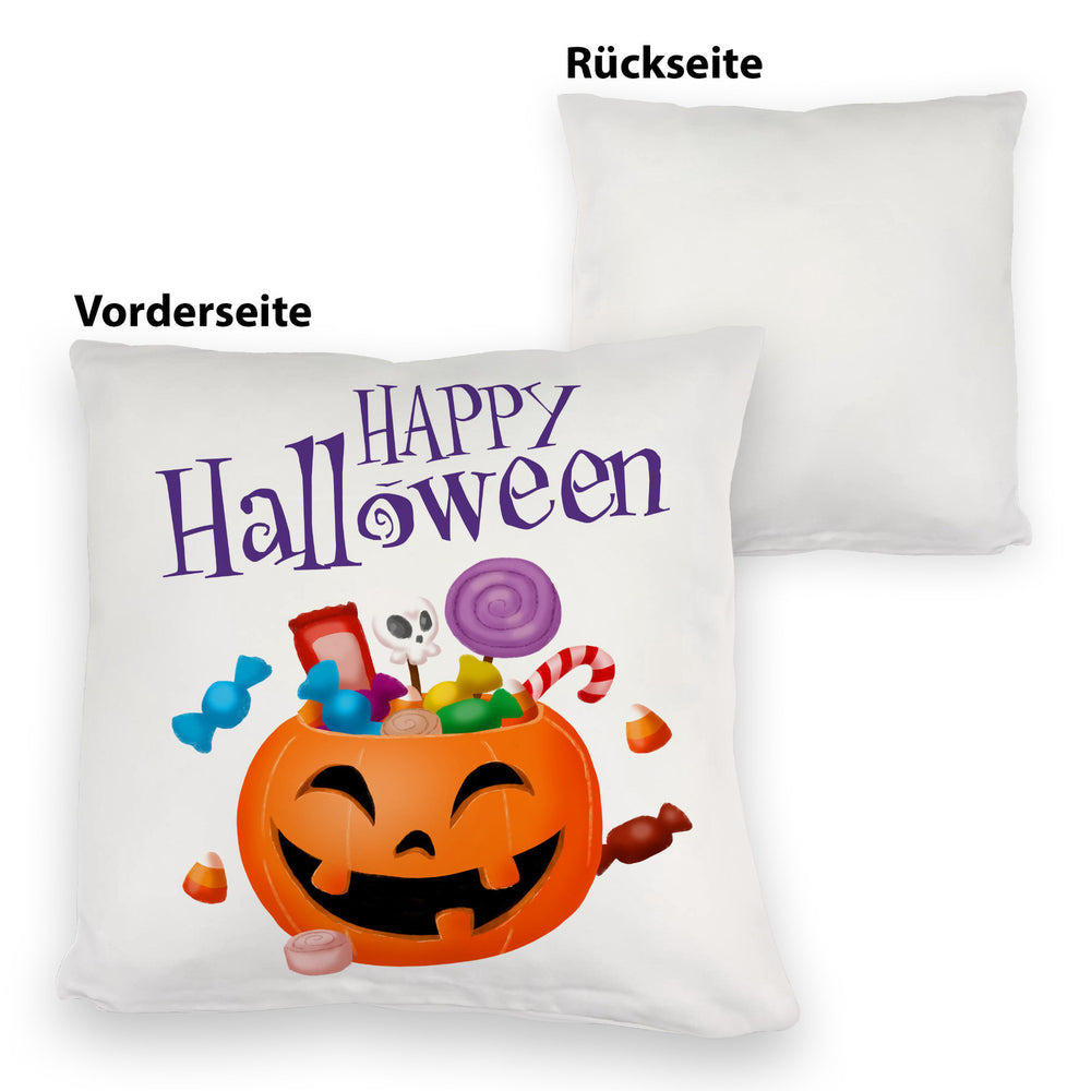 - 1x Happy Halloween Kissen mit Kürbis voller Süßigkeiten in der gewählten Ausführung