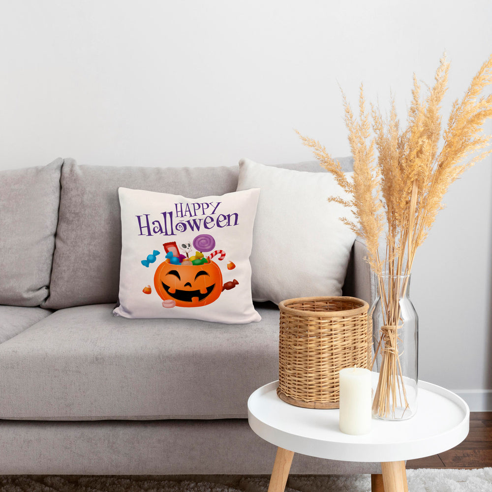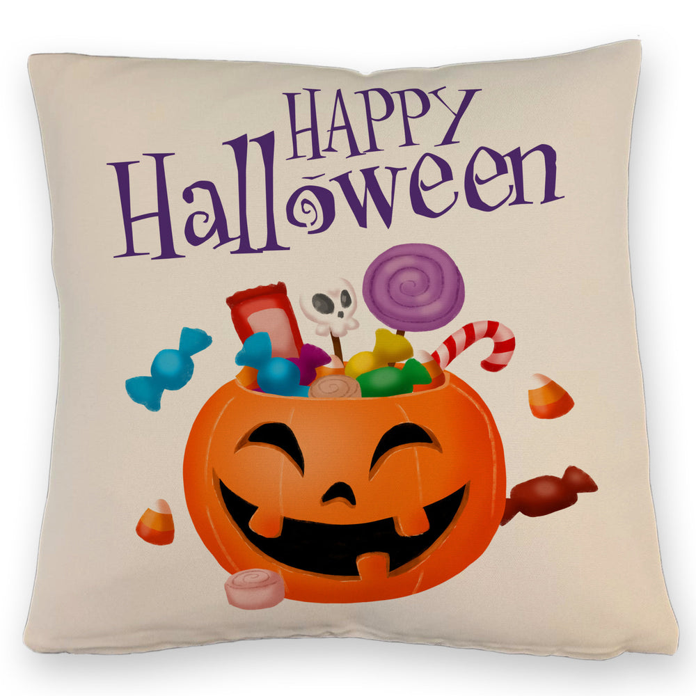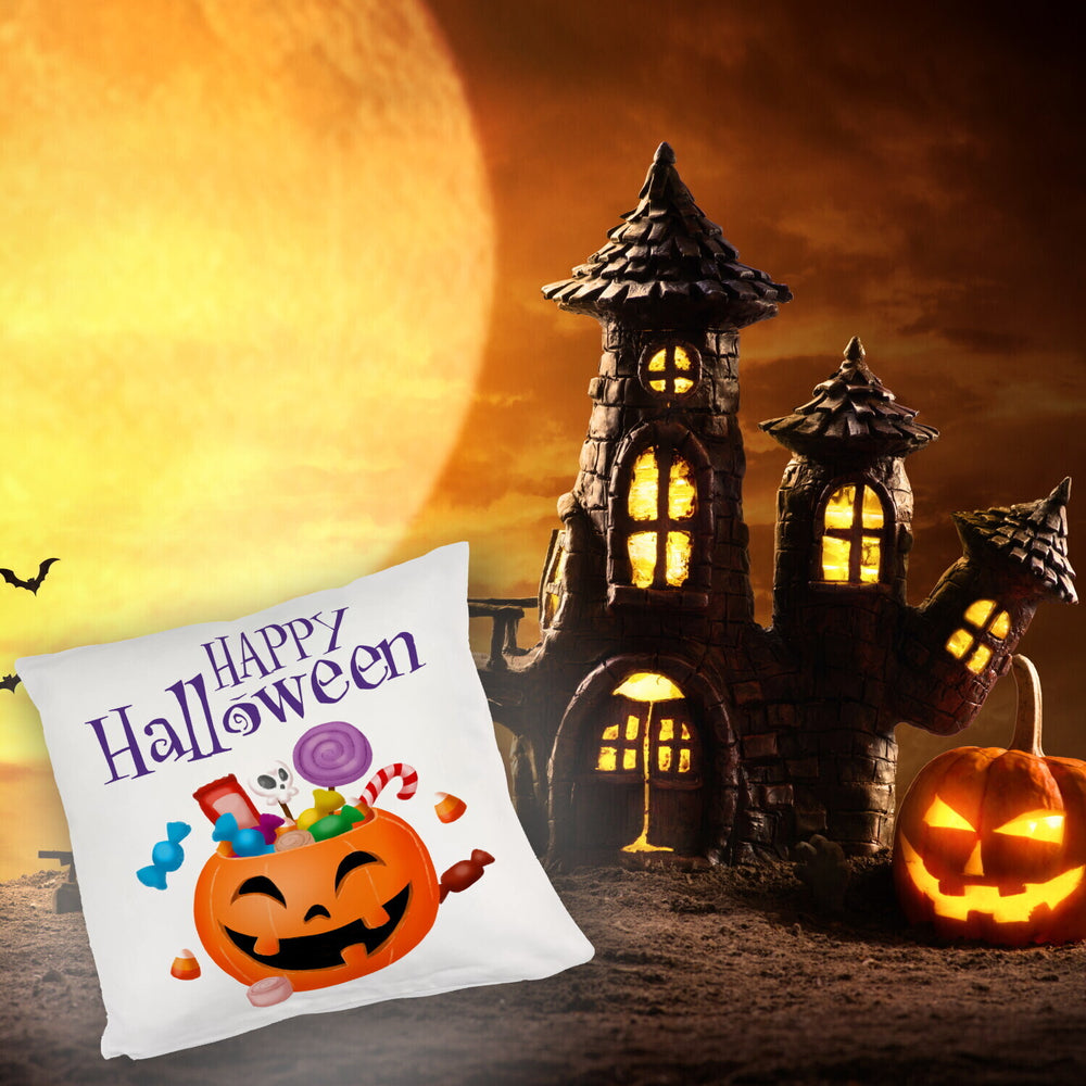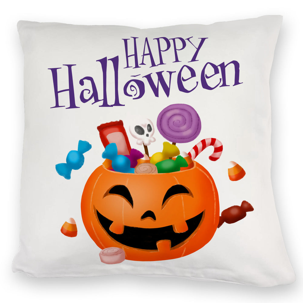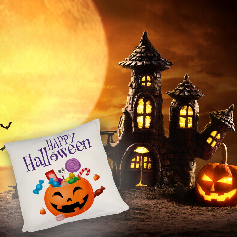 Happy Halloween Kissen mit Kürbis voller Süßigkeiten