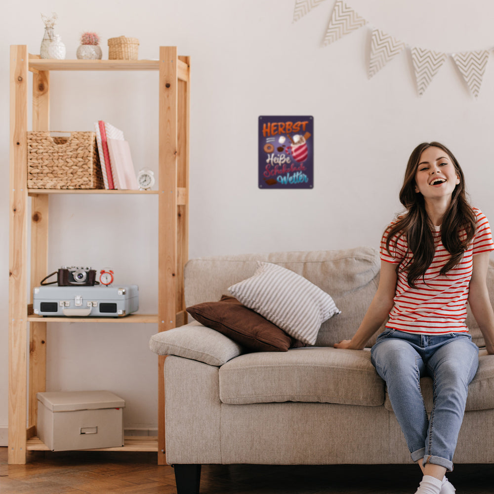 - Der Herbst bringt kältere Tage und stürmisches Wetter. Da möchte man sich nur mit einer Heißer Schokolade und einer Wolldecke einkuscheln. Dieses Schild nimmt diese besondere Herbststimmung auf.